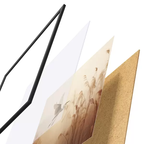 Das Poster besteht aus einem Rahmen, Plexiglas, einem gedruckten Bild und einer Rückwand aus Spanplatten. Dank der Halterungen auf der Rückseite kann das Poster sofort an die Wand gehängt werden.