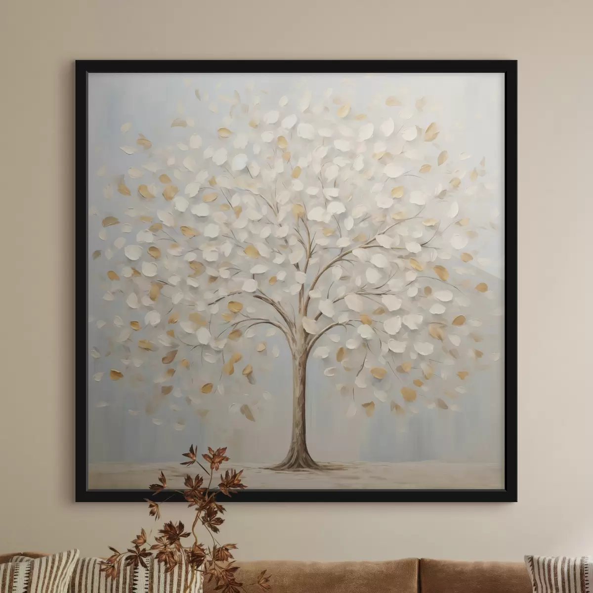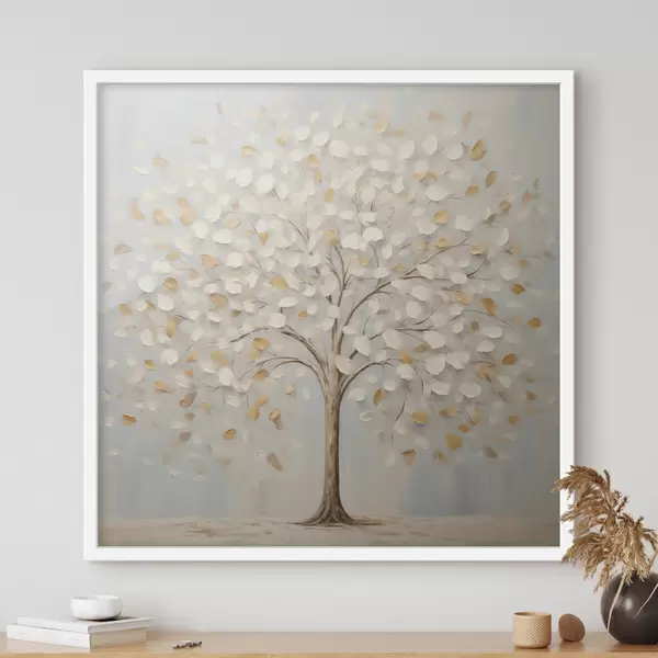Poster Ein strukturierter Malstil, der einen Baum mit weißen und gelben Blättern vor einem hellblauen Hintergrund darstellt f48391
