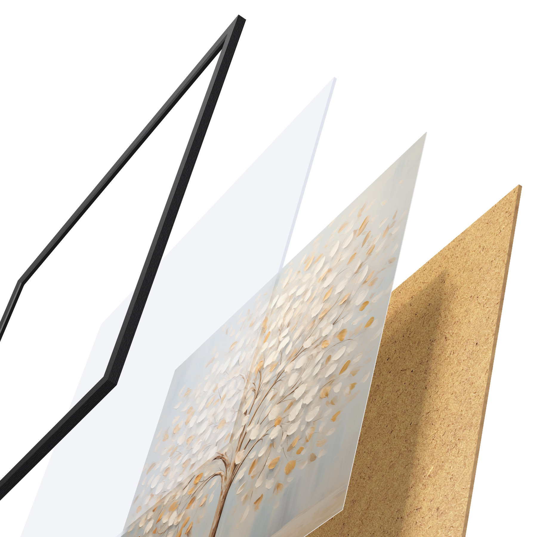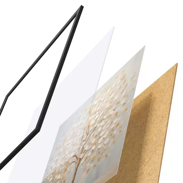 Das Poster besteht aus einem Rahmen, Plexiglas, einem gedruckten Bild und einer Rückwand aus Spanplatten. Dank der Halterungen auf der Rückseite kann das Poster sofort an die Wand gehängt werden.