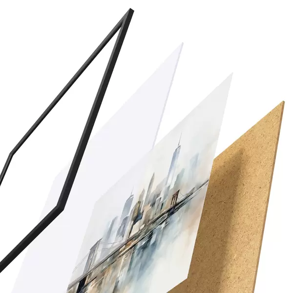 Das Poster besteht aus einem Rahmen, Plexiglas, einem gedruckten Bild und einer Rückwand aus Spanplatten. Dank der Halterungen auf der Rückseite kann das Poster sofort an die Wand gehängt werden.