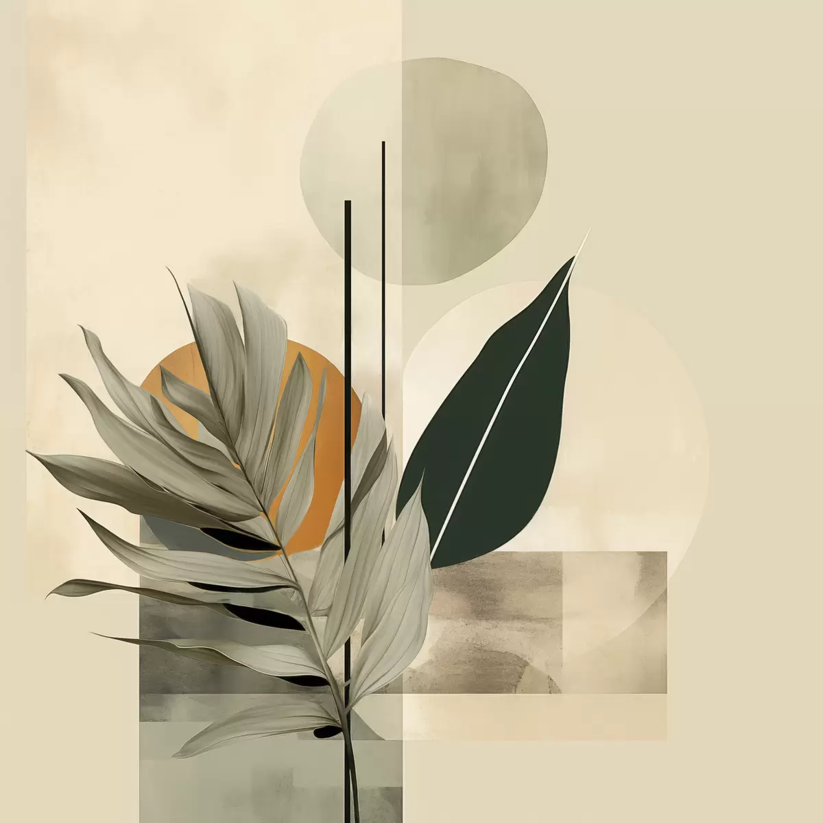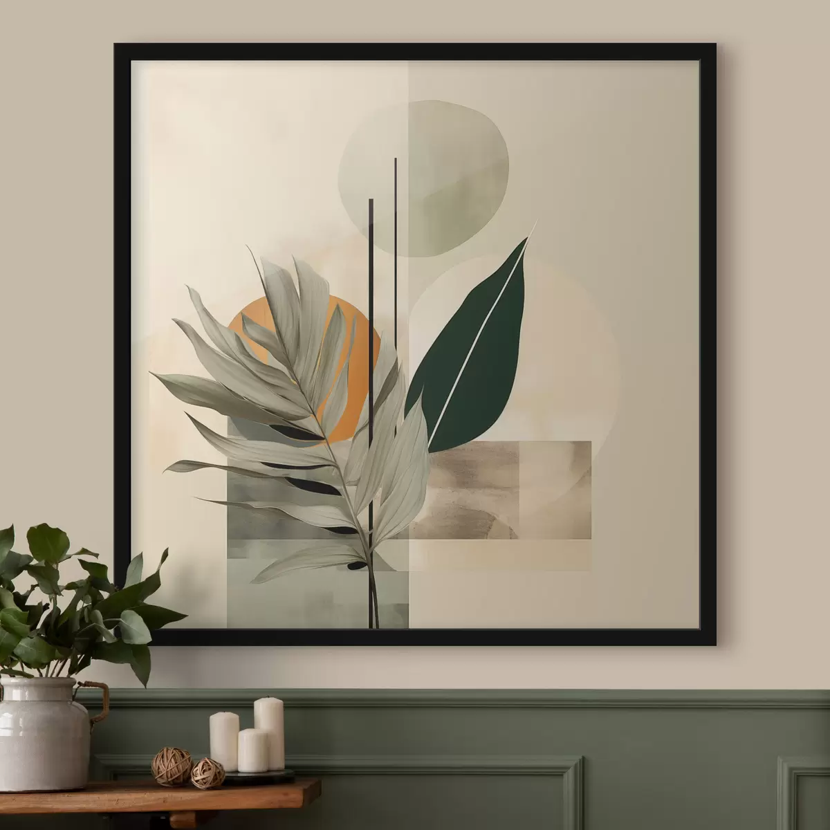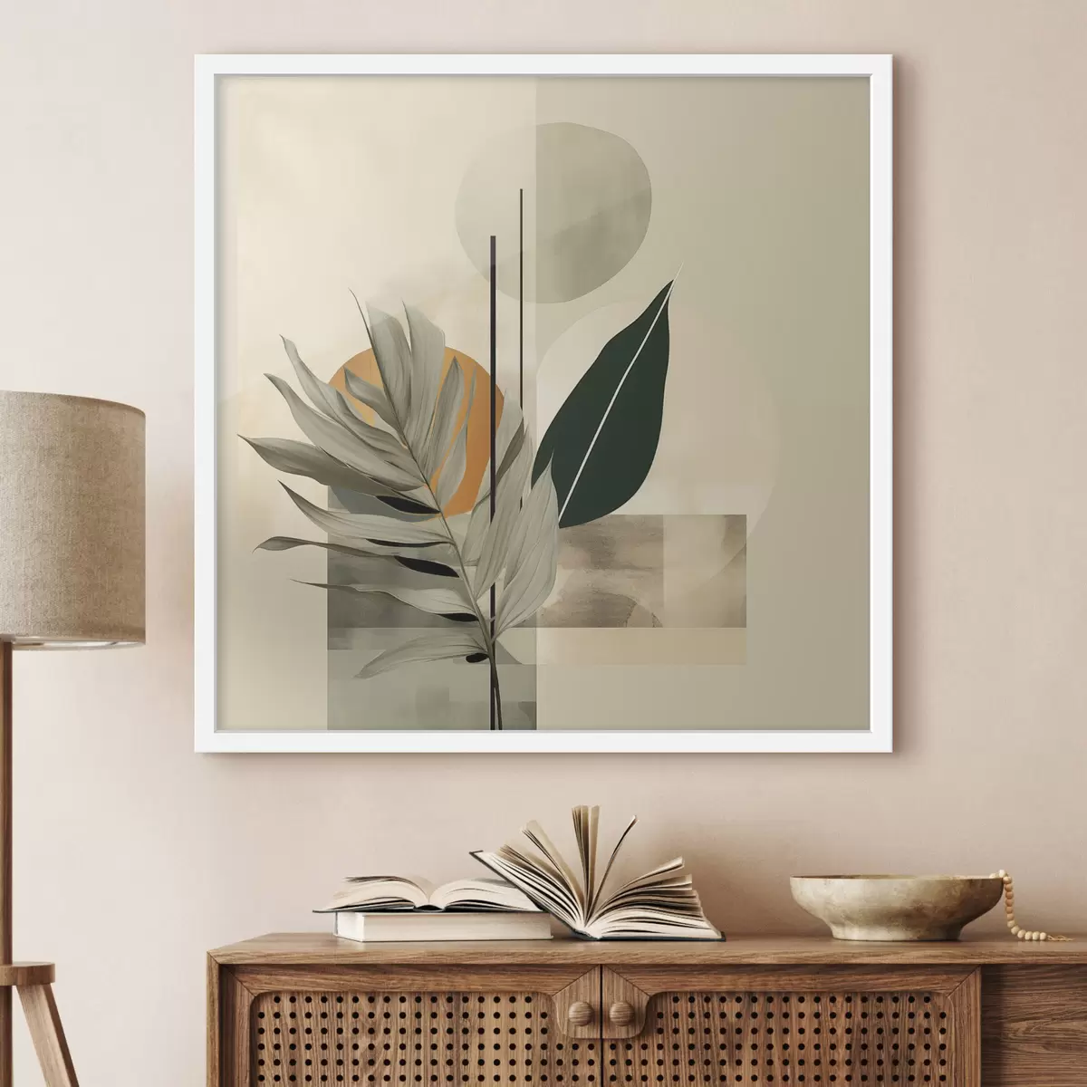Poster Eine dunkelgrüne Pflanze mit abstrakten geometrischen Formen und Aquarellstrukturen in Beige und Grün Nr f48410