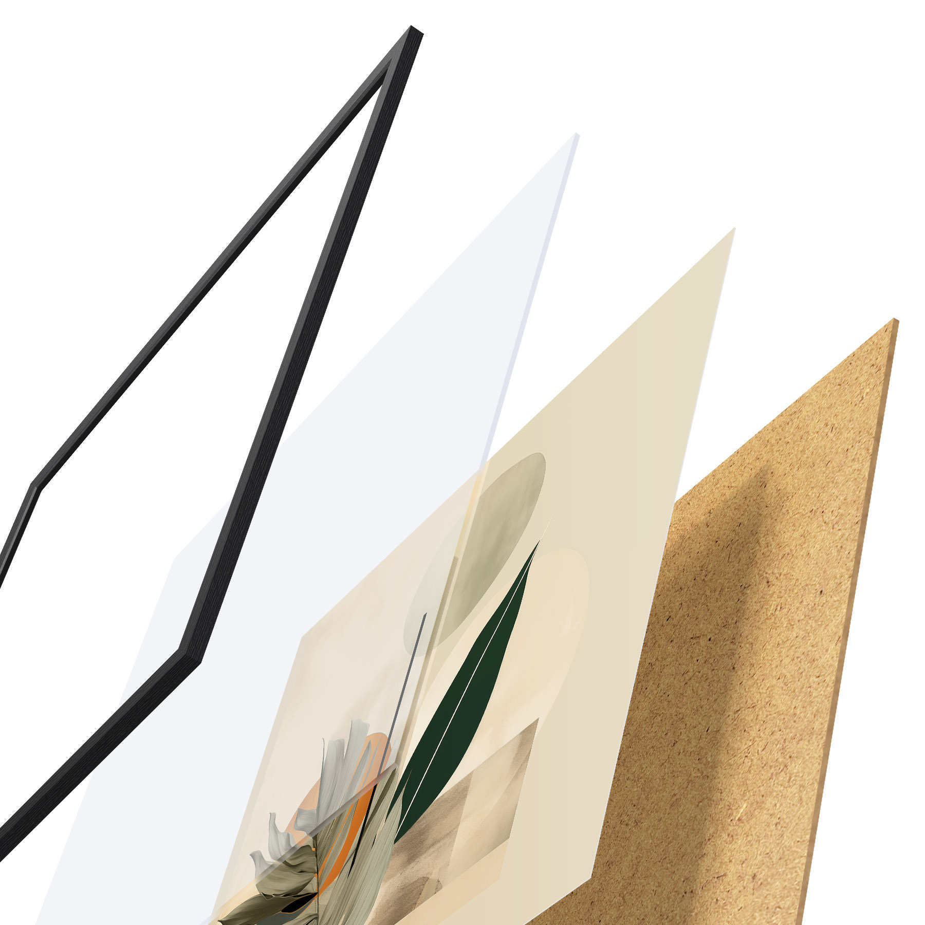 Das Poster besteht aus einem Rahmen, Plexiglas, einem gedruckten Bild und einer Rückwand aus Spanplatten. Dank der Halterungen auf der Rückseite kann das Poster sofort an die Wand gehängt werden.