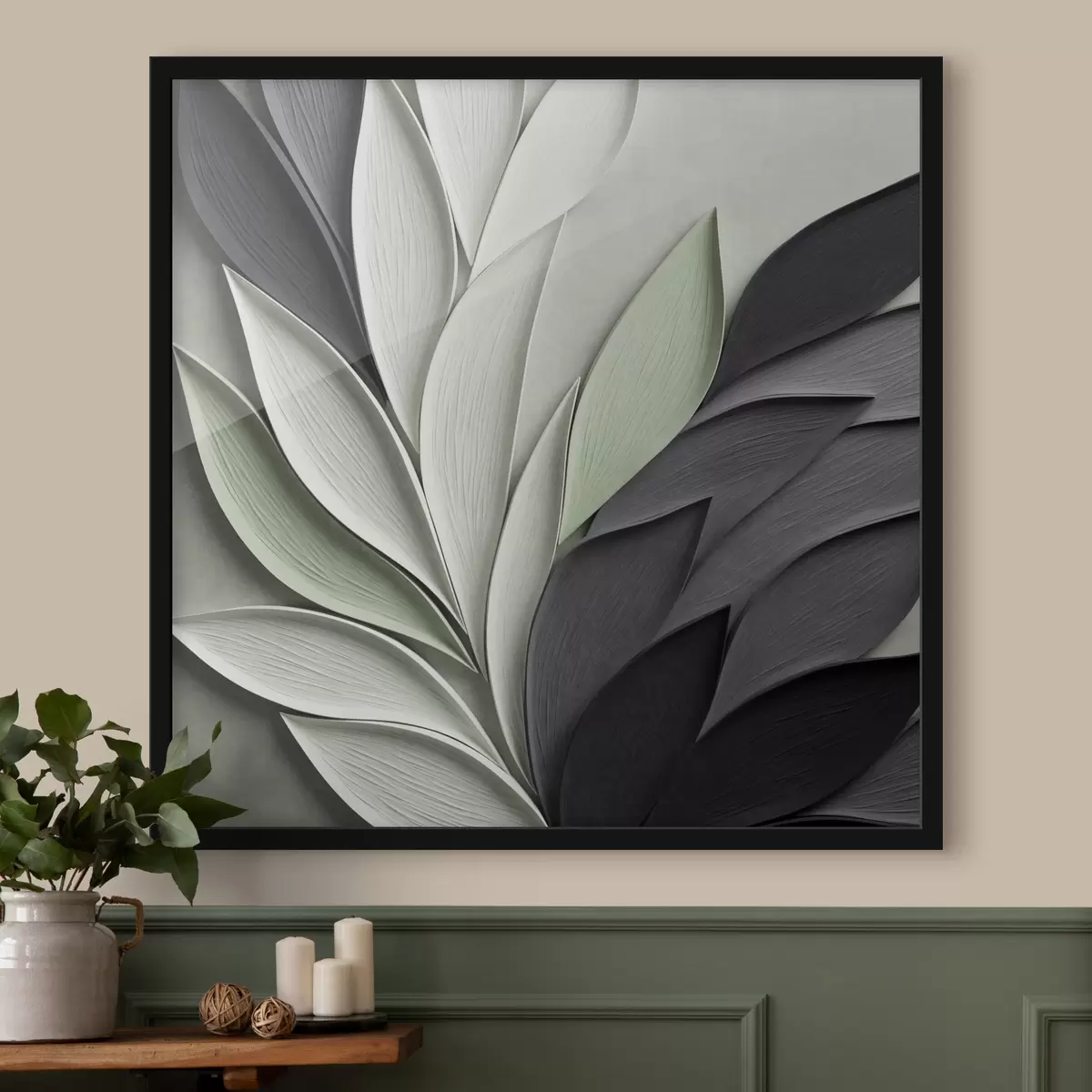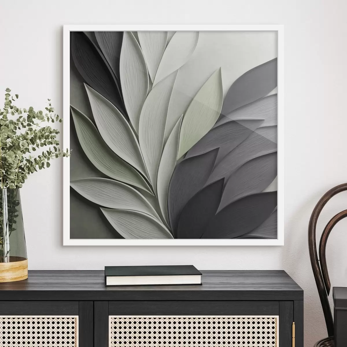 Poster Abstrakte, stilisierte Blätter in Grau-, Weiß- und gedämpften Grüntönen Nr f48411
