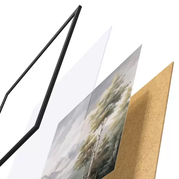 Das Poster besteht aus einem Rahmen, Plexiglas, einem gedruckten Bild und einer Rückwand aus Spanplatten. Dank der Halterungen auf der Rückseite kann das Poster sofort an die Wand gehängt werden.