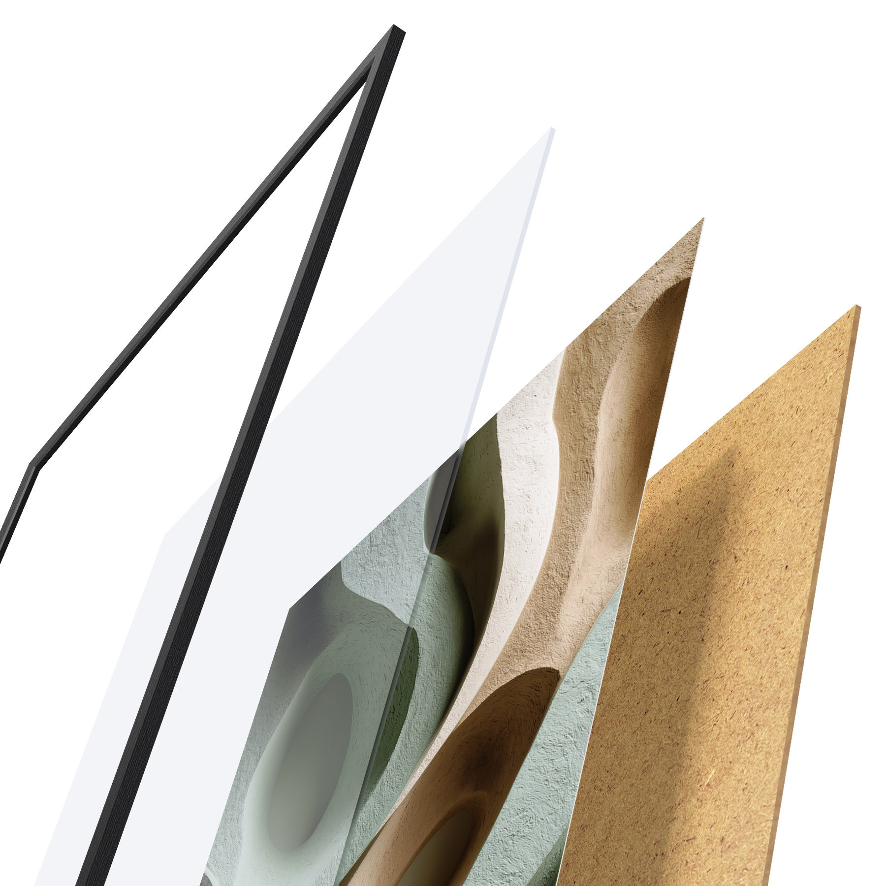 Das Poster besteht aus einem Rahmen, Plexiglas, einem gedruckten Bild und einer Rückwand aus Spanplatten. Dank der Halterungen auf der Rückseite kann das Poster sofort an die Wand gehängt werden.