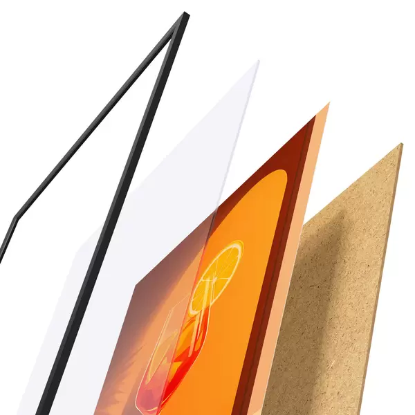 Das Poster besteht aus einem Rahmen, Plexiglas, einem gedruckten Bild und einer Rückwand aus Spanplatten. Dank der Halterungen auf der Rückseite kann das Poster sofort an die Wand gehängt werden.