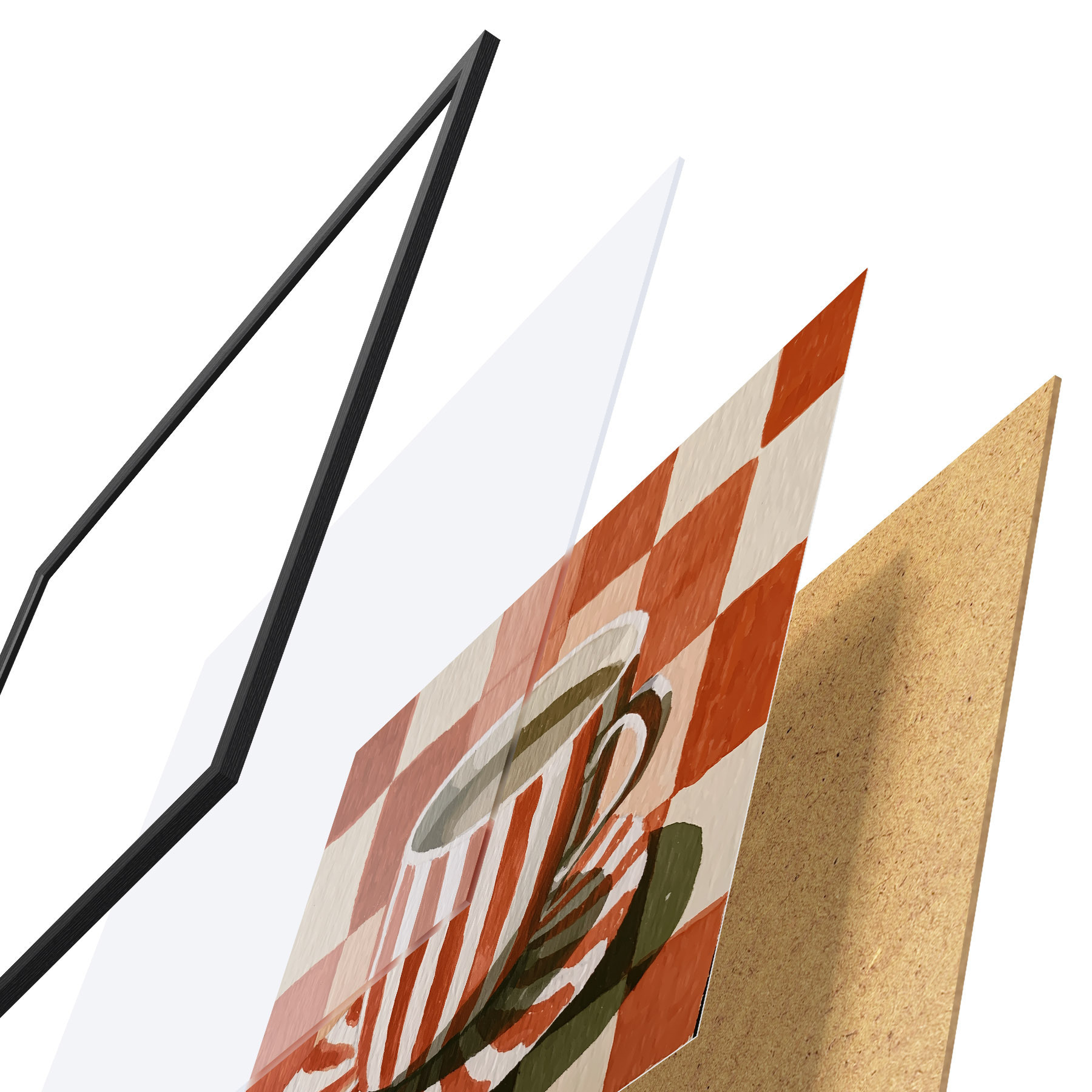 Das Poster besteht aus einem Rahmen, Plexiglas, einem gedruckten Bild und einer Rückwand aus Spanplatten. Dank der Halterungen auf der Rückseite kann das Poster sofort an die Wand gehängt werden.