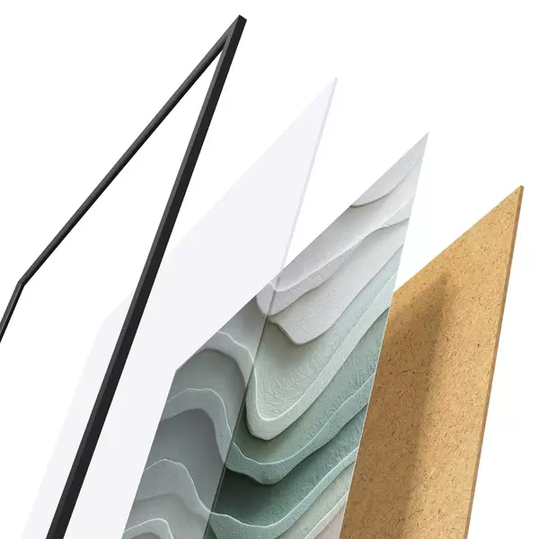 Das Poster besteht aus einem Rahmen, Plexiglas, einem gedruckten Bild und einer Rückwand aus Spanplatten. Dank der Halterungen auf der Rückseite kann das Poster sofort an die Wand gehängt werden.