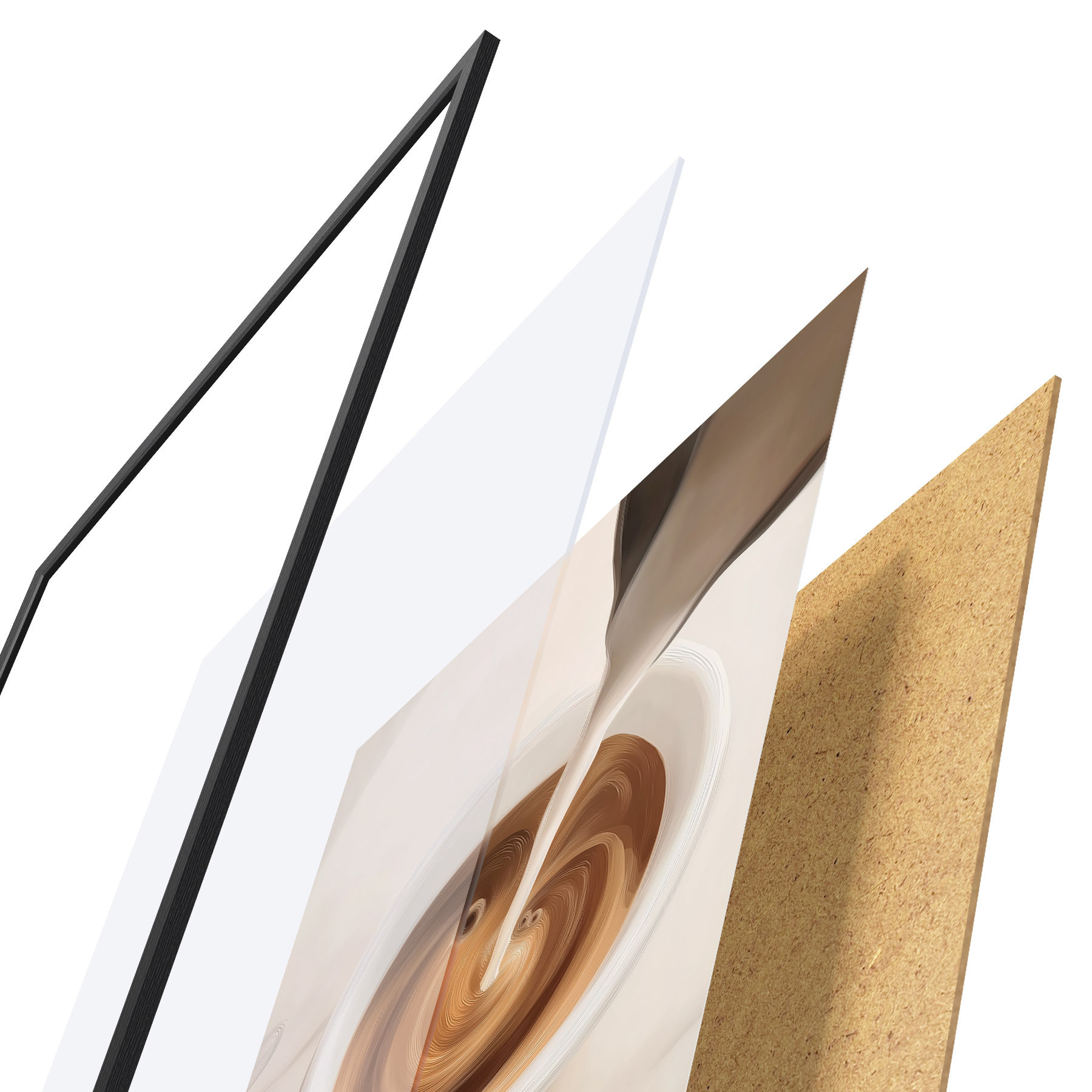 Das Poster besteht aus einem Rahmen, Plexiglas, einem gedruckten Bild und einer Rückwand aus Spanplatten. Dank der Halterungen auf der Rückseite kann das Poster sofort an die Wand gehängt werden.