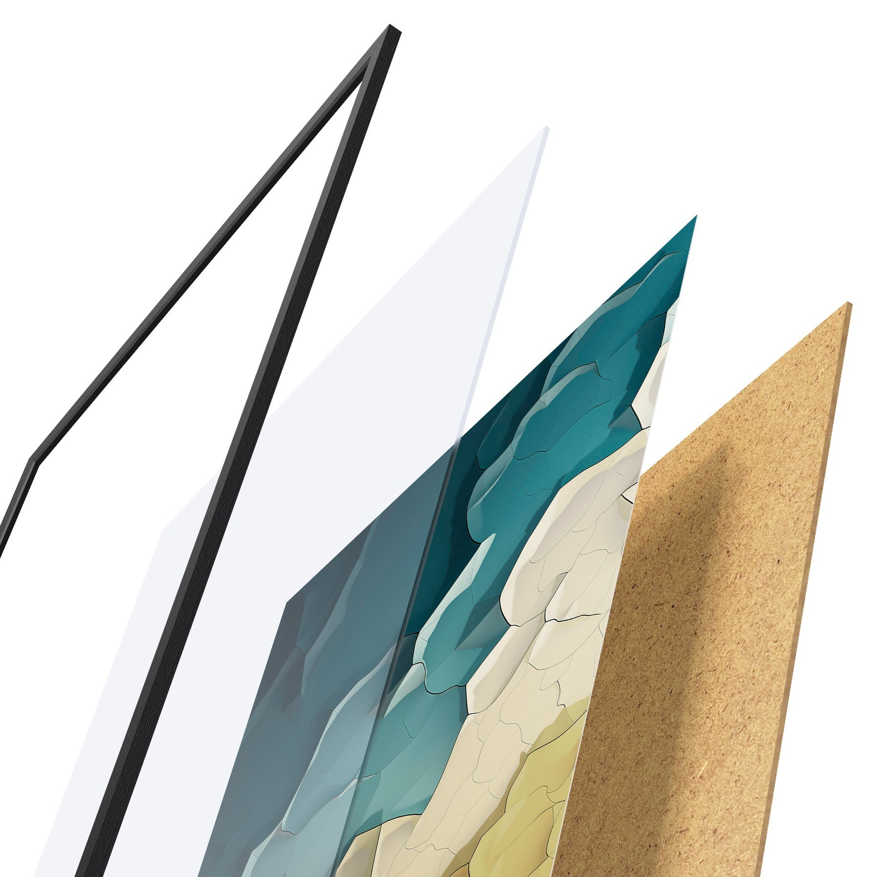 Das Poster besteht aus einem Rahmen, Plexiglas, einem gedruckten Bild und einer Rückwand aus Spanplatten. Dank der Halterungen auf der Rückseite kann das Poster sofort an die Wand gehängt werden.