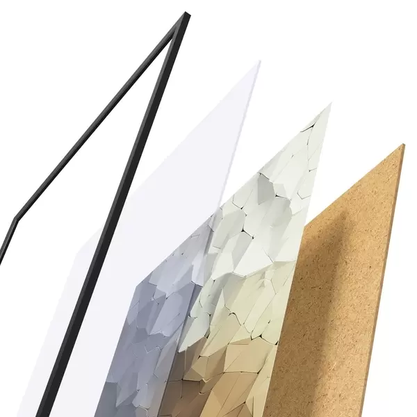 Das Poster besteht aus einem Rahmen, Plexiglas, einem gedruckten Bild und einer Rückwand aus Spanplatten. Dank der Halterungen auf der Rückseite kann das Poster sofort an die Wand gehängt werden.
