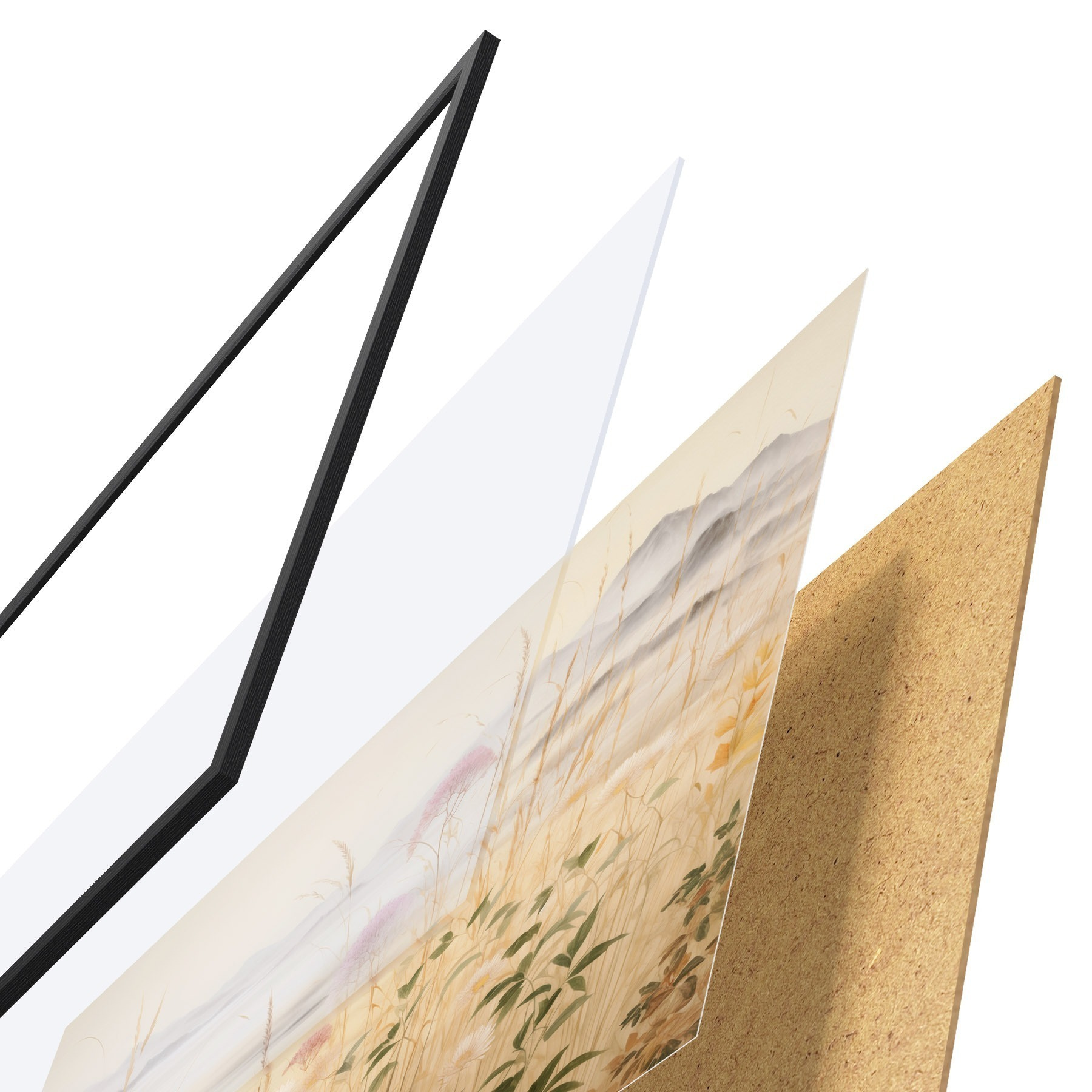 Das Poster besteht aus einem Rahmen, Plexiglas, einem gedruckten Bild und einer Rückwand aus Spanplatten. Dank der Halterungen auf der Rückseite kann das Poster sofort an die Wand gehängt werden.