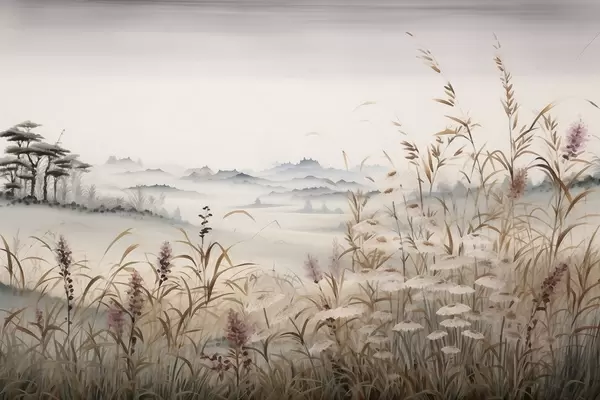 Poster Nebelverhangene Landschaft mit Gräsern Nr f48481