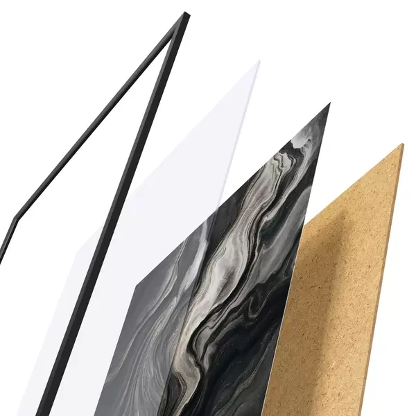 Das Poster besteht aus einem Rahmen, Plexiglas, einem gedruckten Bild und einer Rückwand aus Spanplatten. Dank der Halterungen auf der Rückseite kann das Poster sofort an die Wand gehängt werden.