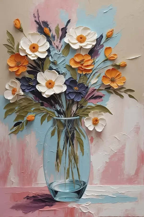 Poster Blumenstrauß in einer Glasvase vor einem bunten Hintergrund Nr f48488