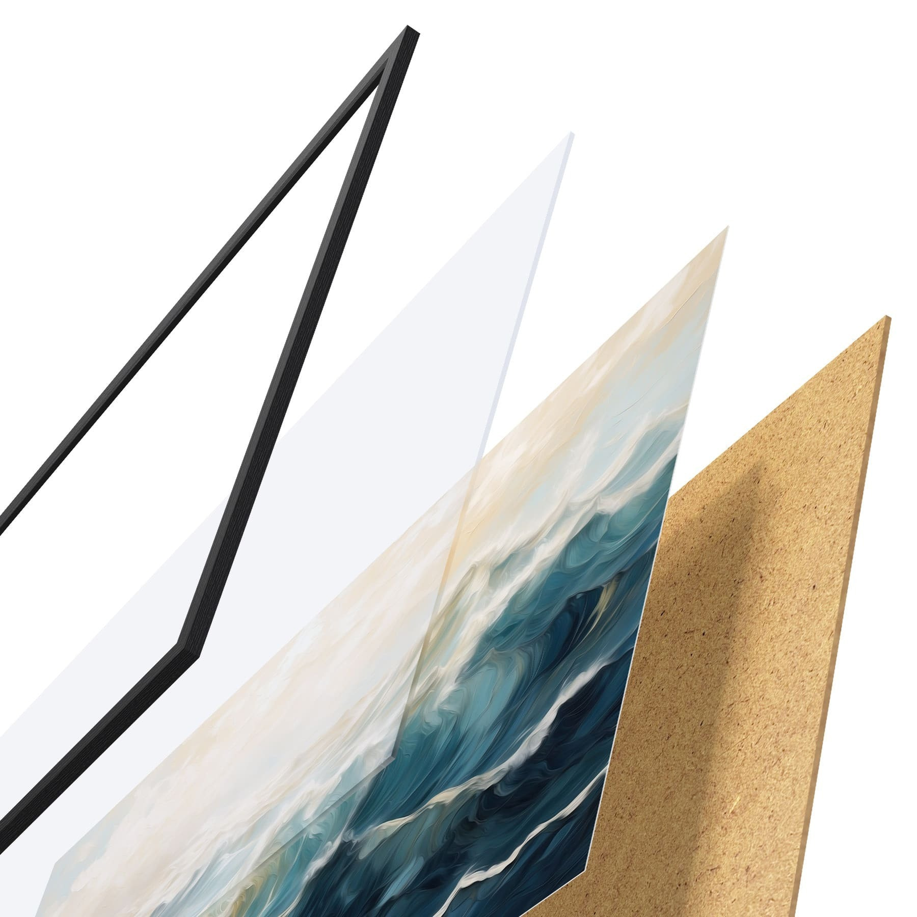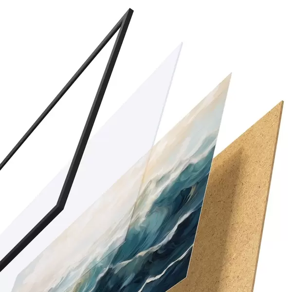 Das Poster besteht aus einem Rahmen, Plexiglas, einem gedruckten Bild und einer Rückwand aus Spanplatten. Dank der Halterungen auf der Rückseite kann das Poster sofort an die Wand gehängt werden.