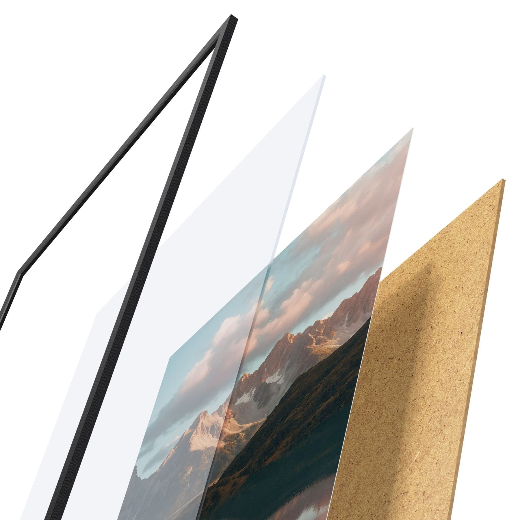 Das Poster besteht aus einem Rahmen, Plexiglas, einem gedruckten Bild und einer Rückwand aus Spanplatten. Dank der Halterungen auf der Rückseite kann das Poster sofort an die Wand gehängt werden.