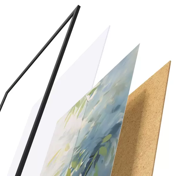 Das Poster besteht aus einem Rahmen, Plexiglas, einem gedruckten Bild und einer Rückwand aus Spanplatten. Dank der Halterungen auf der Rückseite kann das Poster sofort an die Wand gehängt werden.