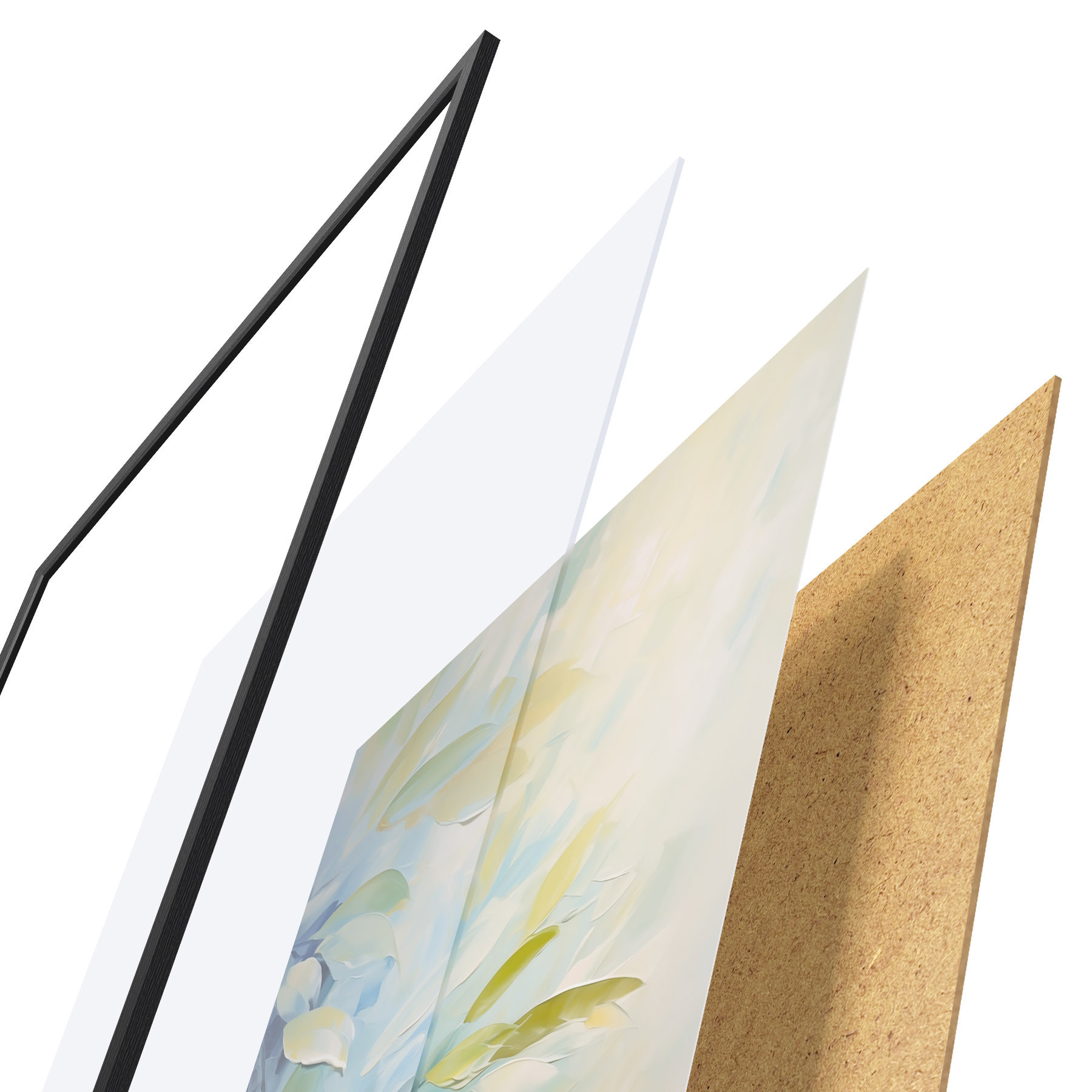 Das Poster besteht aus einem Rahmen, Plexiglas, einem gedruckten Bild und einer Rückwand aus Spanplatten. Dank der Halterungen auf der Rückseite kann das Poster sofort an die Wand gehängt werden.