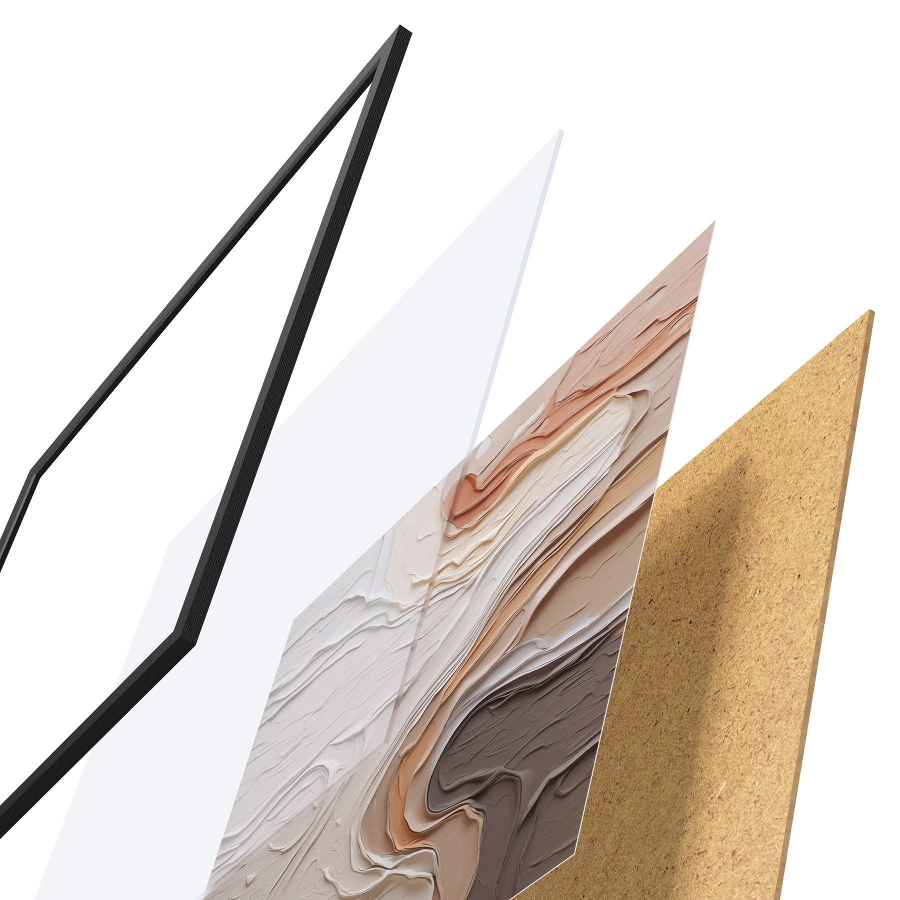 Das Poster besteht aus einem Rahmen, Plexiglas, einem gedruckten Bild und einer Rückwand aus Spanplatten. Dank der Halterungen auf der Rückseite kann das Poster sofort an die Wand gehängt werden.