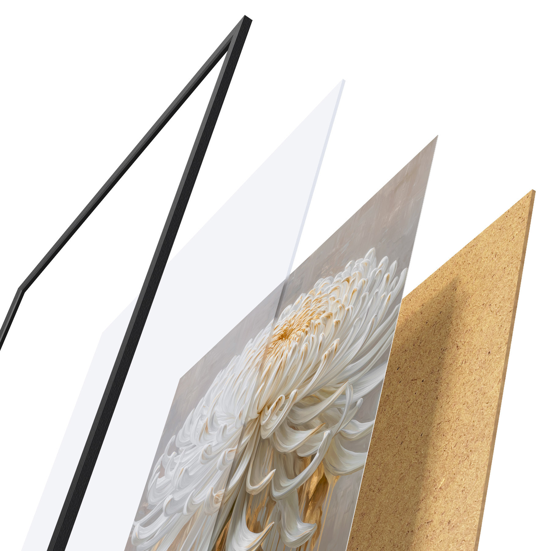 Das Poster besteht aus einem Rahmen, Plexiglas, einem gedruckten Bild und einer Rückwand aus Spanplatten. Dank der Halterungen auf der Rückseite kann das Poster sofort an die Wand gehängt werden.