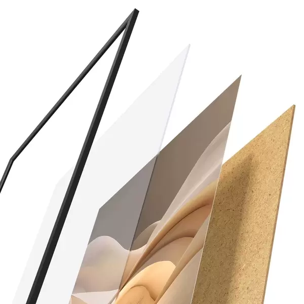 Das Poster besteht aus einem Rahmen, Plexiglas, einem gedruckten Bild und einer Rückwand aus Spanplatten. Dank der Halterungen auf der Rückseite kann das Poster sofort an die Wand gehängt werden.