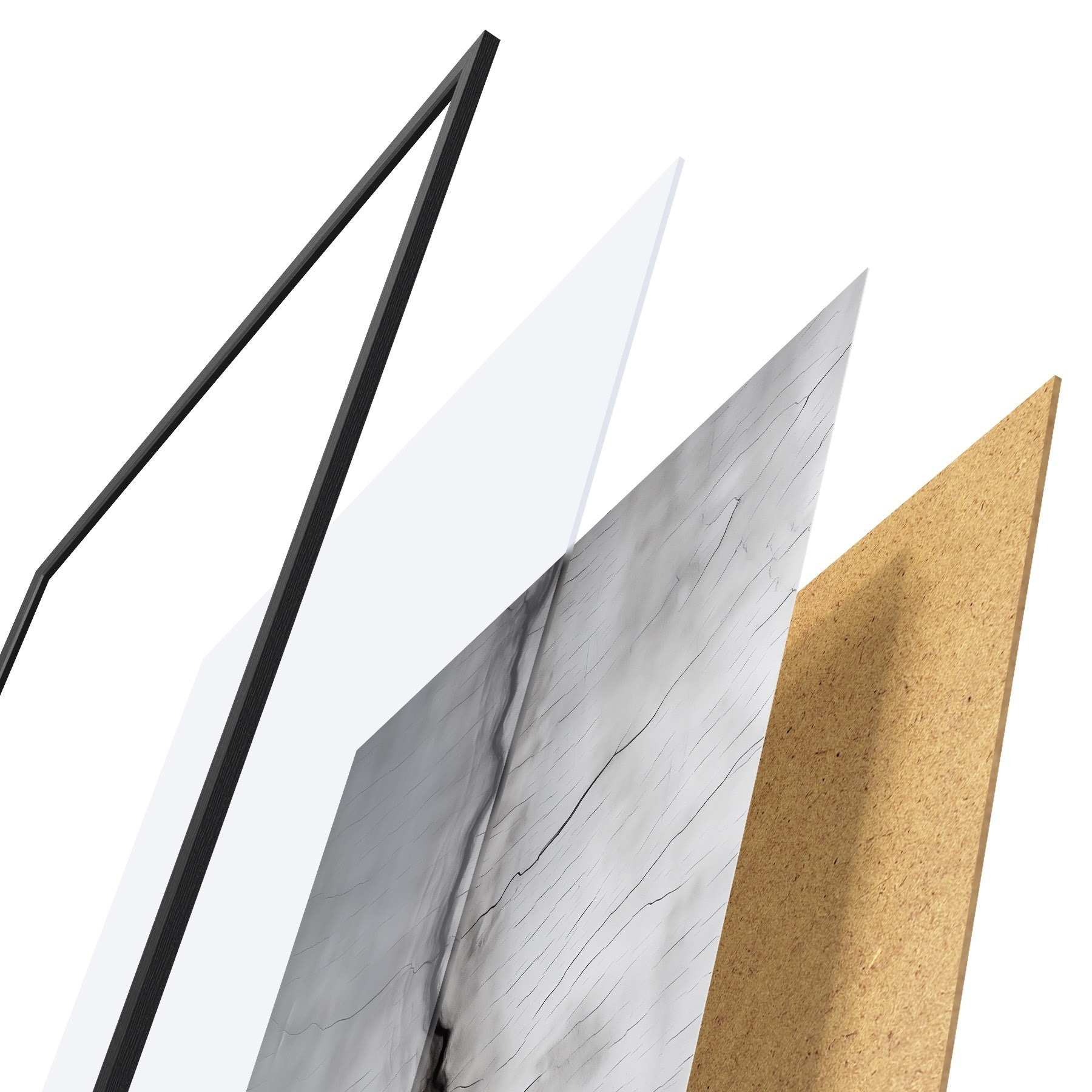 Das Poster besteht aus einem Rahmen, Plexiglas, einem gedruckten Bild und einer Rückwand aus Spanplatten. Dank der Halterungen auf der Rückseite kann das Poster sofort an die Wand gehängt werden.