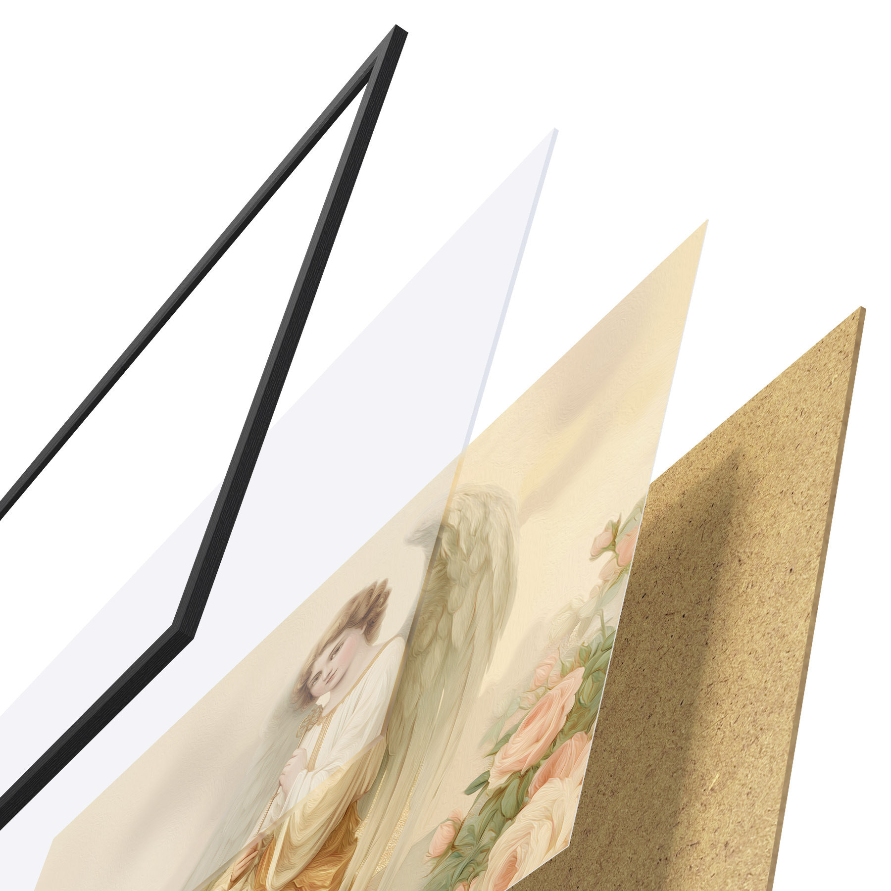 Das Poster besteht aus einem Rahmen, Plexiglas, einem gedruckten Bild und einer Rückwand aus Spanplatten. Dank der Halterungen auf der Rückseite kann das Poster sofort an die Wand gehängt werden.