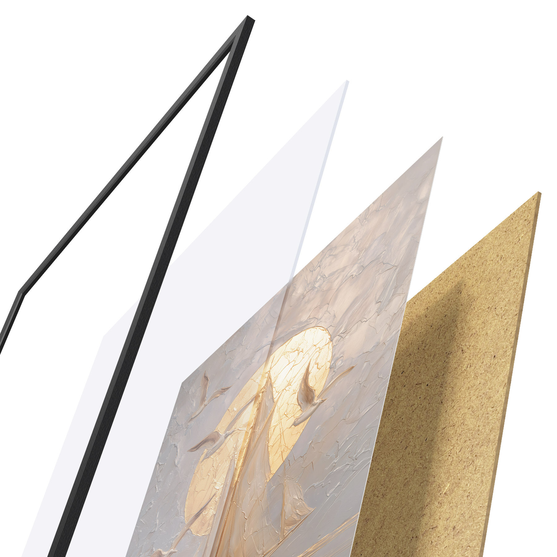 Das Poster besteht aus einem Rahmen, Plexiglas, einem gedruckten Bild und einer Rückwand aus Spanplatten. Dank der Halterungen auf der Rückseite kann das Poster sofort an die Wand gehängt werden.