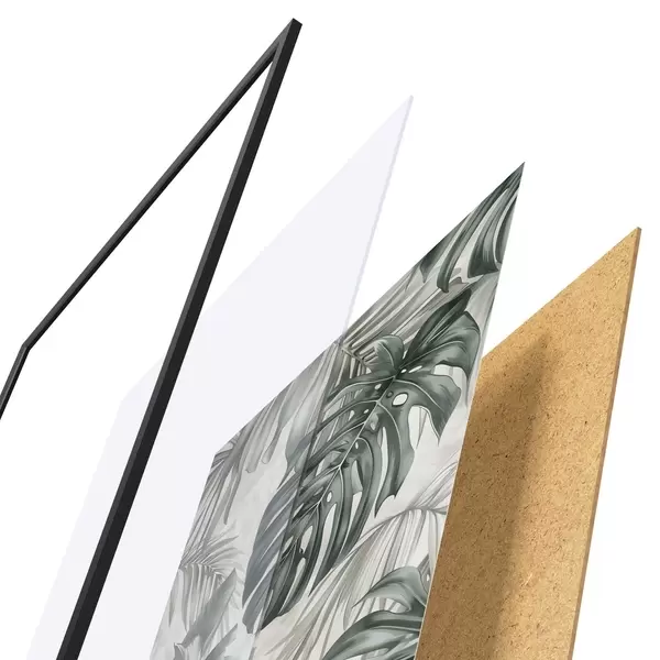Das Poster besteht aus einem Rahmen, Plexiglas, einem gedruckten Bild und einer Rückwand aus Spanplatten. Dank der Halterungen auf der Rückseite kann das Poster sofort an die Wand gehängt werden.