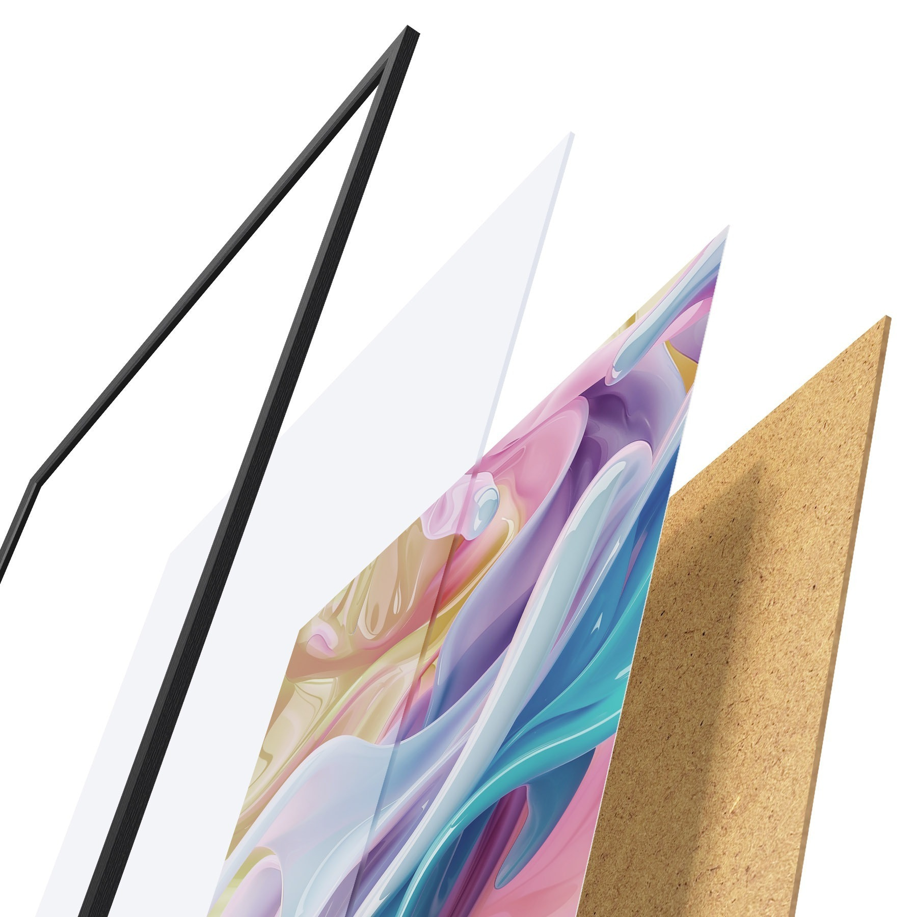 Das Poster besteht aus einem Rahmen, Plexiglas, einem gedruckten Bild und einer Rückwand aus Spanplatten. Dank der Halterungen auf der Rückseite kann das Poster sofort an die Wand gehängt werden.