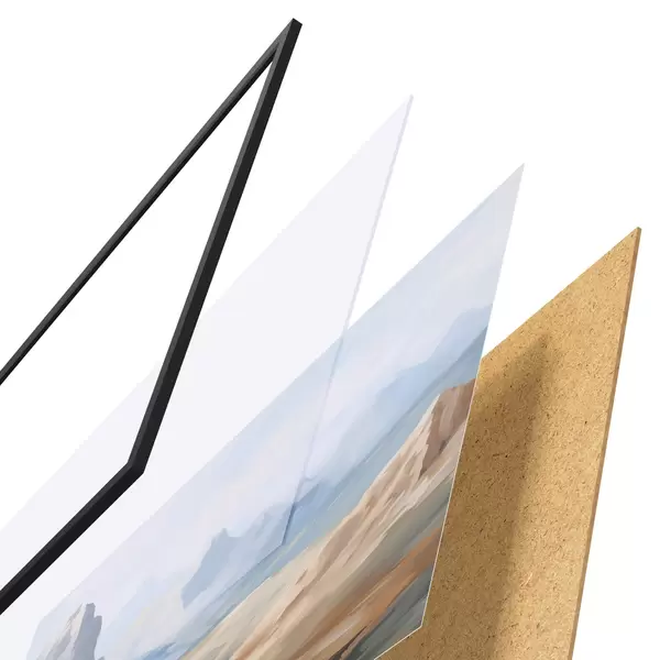 Das Poster besteht aus einem Rahmen, Plexiglas, einem gedruckten Bild und einer Rückwand aus Spanplatten. Dank der Halterungen auf der Rückseite kann das Poster sofort an die Wand gehängt werden.