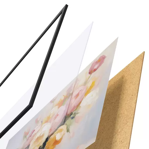 Das Poster besteht aus einem Rahmen, Plexiglas, einem gedruckten Bild und einer Rückwand aus Spanplatten. Dank der Halterungen auf der Rückseite kann das Poster sofort an die Wand gehängt werden.