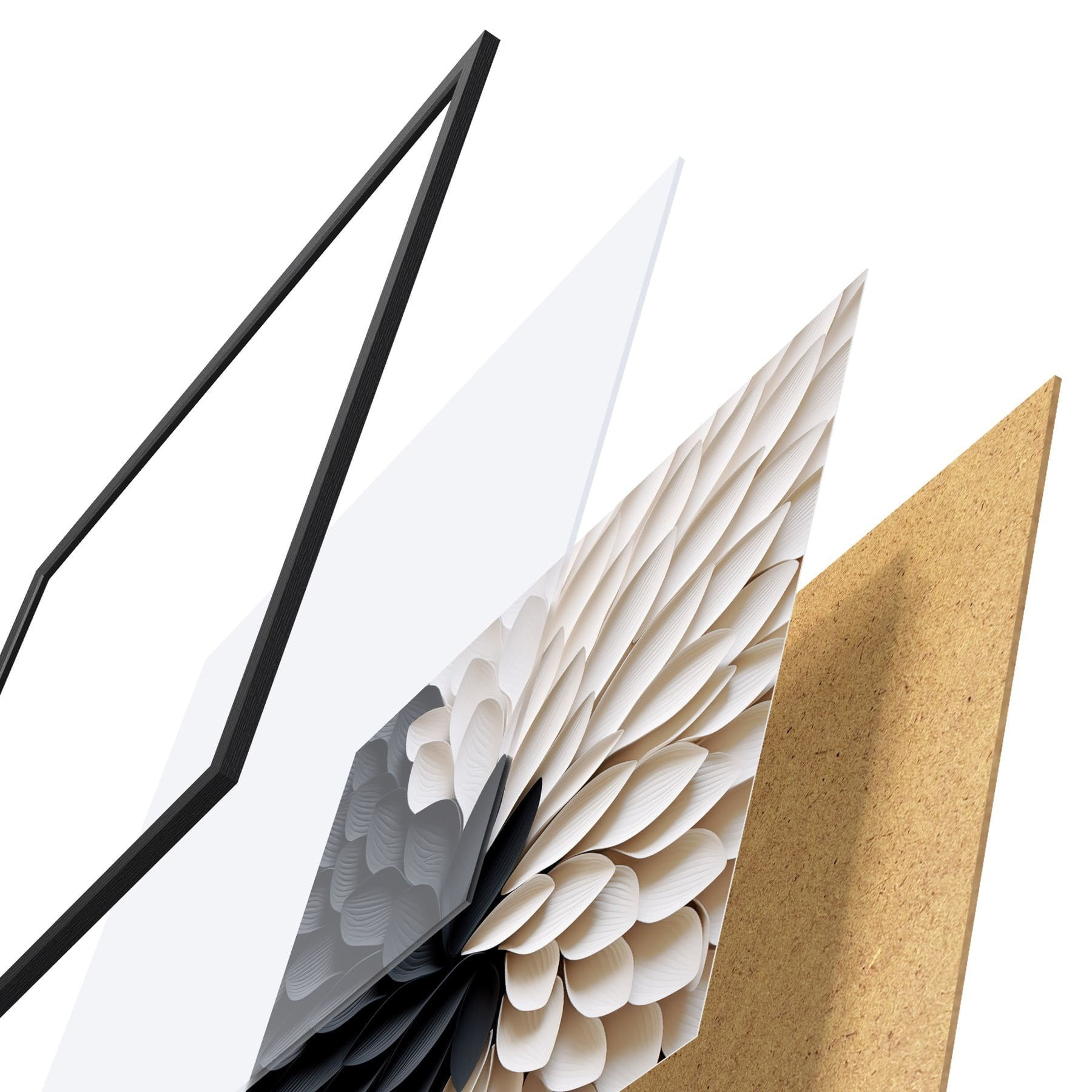 Das Poster besteht aus einem Rahmen, Plexiglas, einem gedruckten Bild und einer Rückwand aus Spanplatten. Dank der Halterungen auf der Rückseite kann das Poster sofort an die Wand gehängt werden.