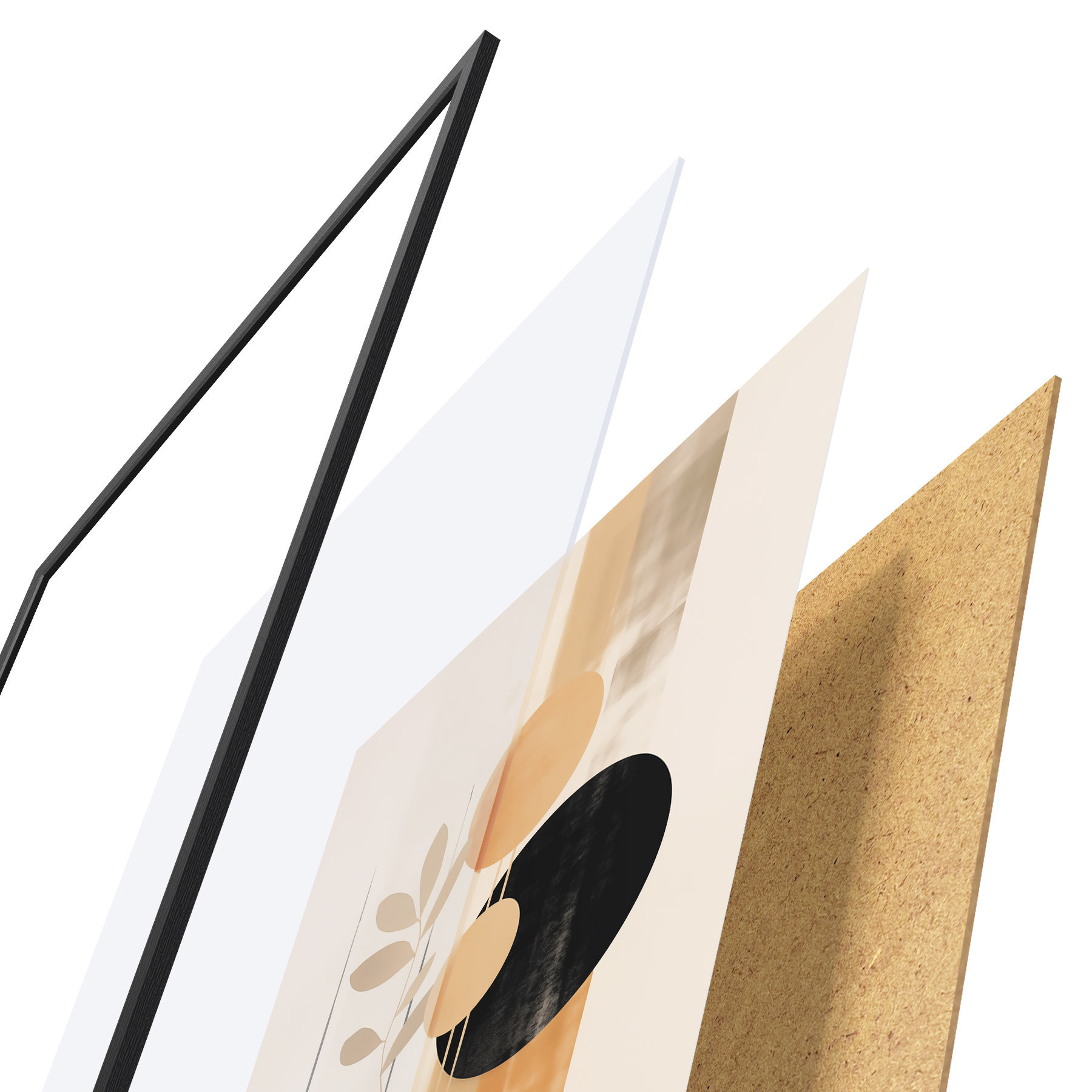 Das Poster besteht aus einem Rahmen, Plexiglas, einem gedruckten Bild und einer Rückwand aus Spanplatten. Dank der Halterungen auf der Rückseite kann das Poster sofort an die Wand gehängt werden.