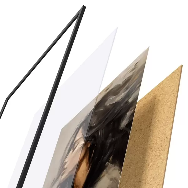 Das Poster besteht aus einem Rahmen, Plexiglas, einem gedruckten Bild und einer Rückwand aus Spanplatten. Dank der Halterungen auf der Rückseite kann das Poster sofort an die Wand gehängt werden.