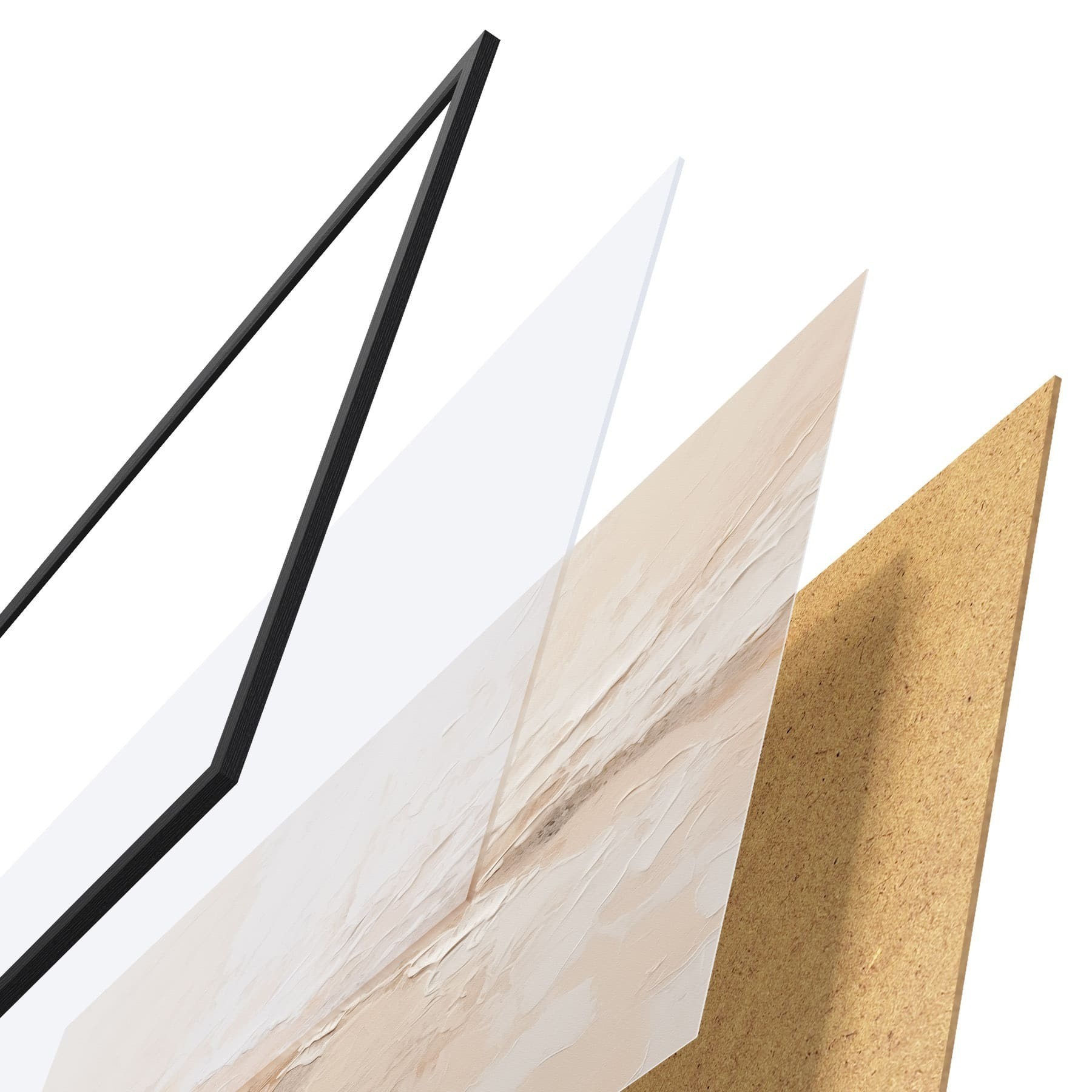 Das Poster besteht aus einem Rahmen, Plexiglas, einem gedruckten Bild und einer Rückwand aus Spanplatten. Dank der Halterungen auf der Rückseite kann das Poster sofort an die Wand gehängt werden.