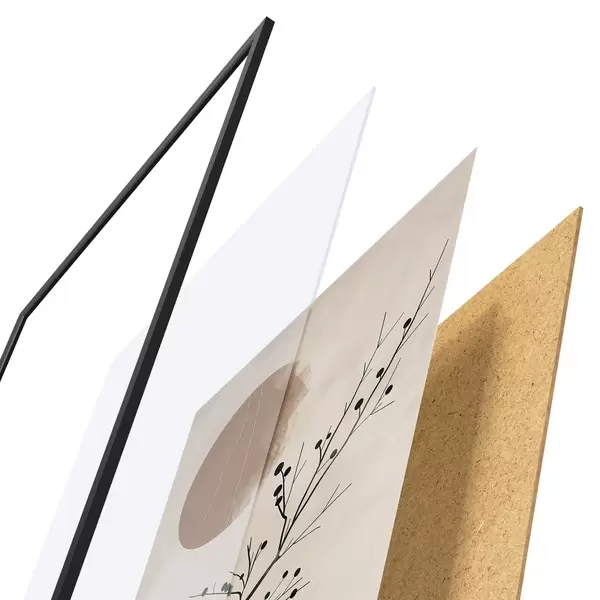 Das Poster besteht aus einem Rahmen, Plexiglas, einem gedruckten Bild und einer Rückwand aus Spanplatten. Dank der Halterungen auf der Rückseite kann das Poster sofort an die Wand gehängt werden.