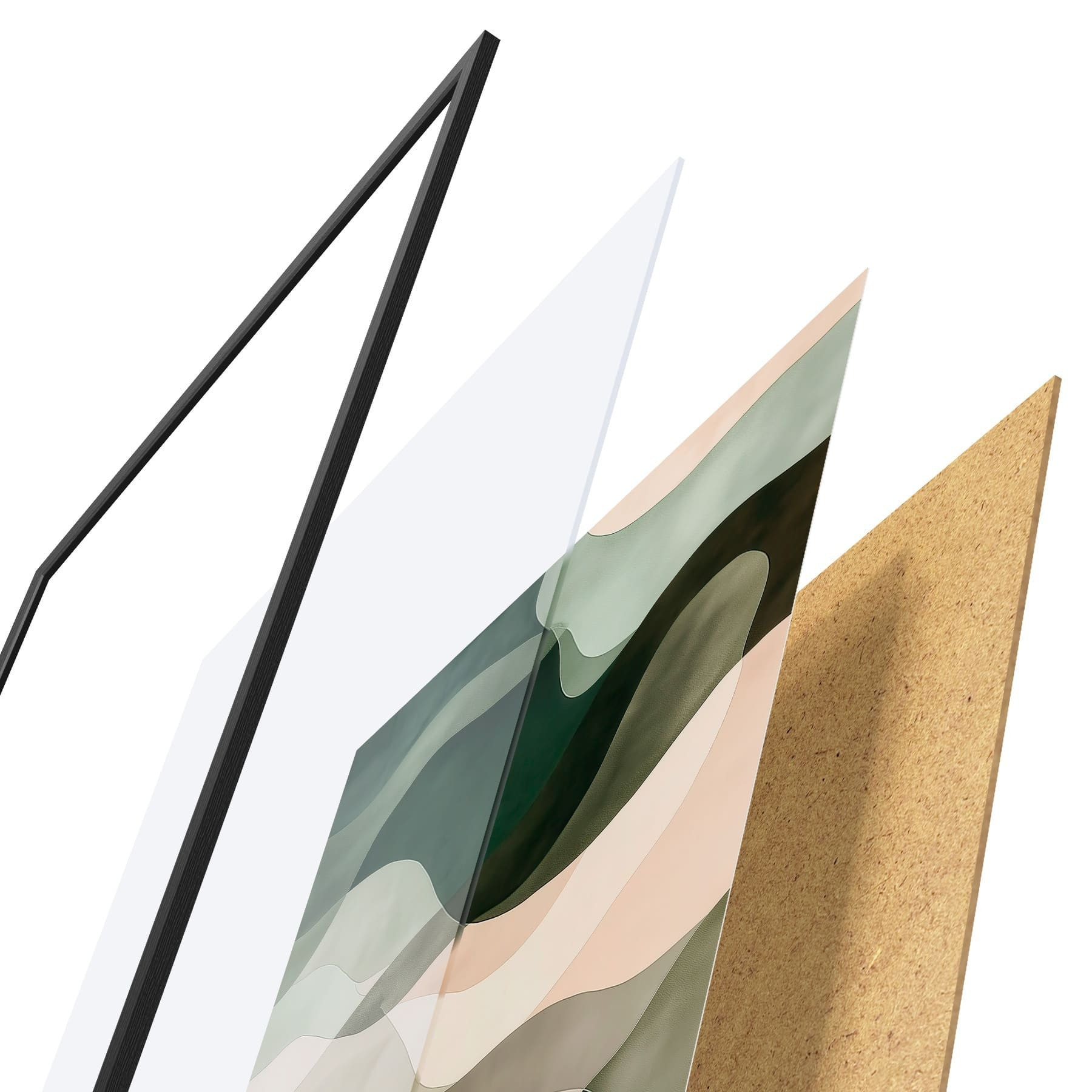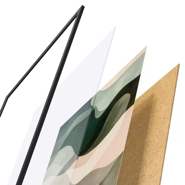 Das Poster besteht aus einem Rahmen, Plexiglas, einem gedruckten Bild und einer Rückwand aus Spanplatten. Dank der Halterungen auf der Rückseite kann das Poster sofort an die Wand gehängt werden.