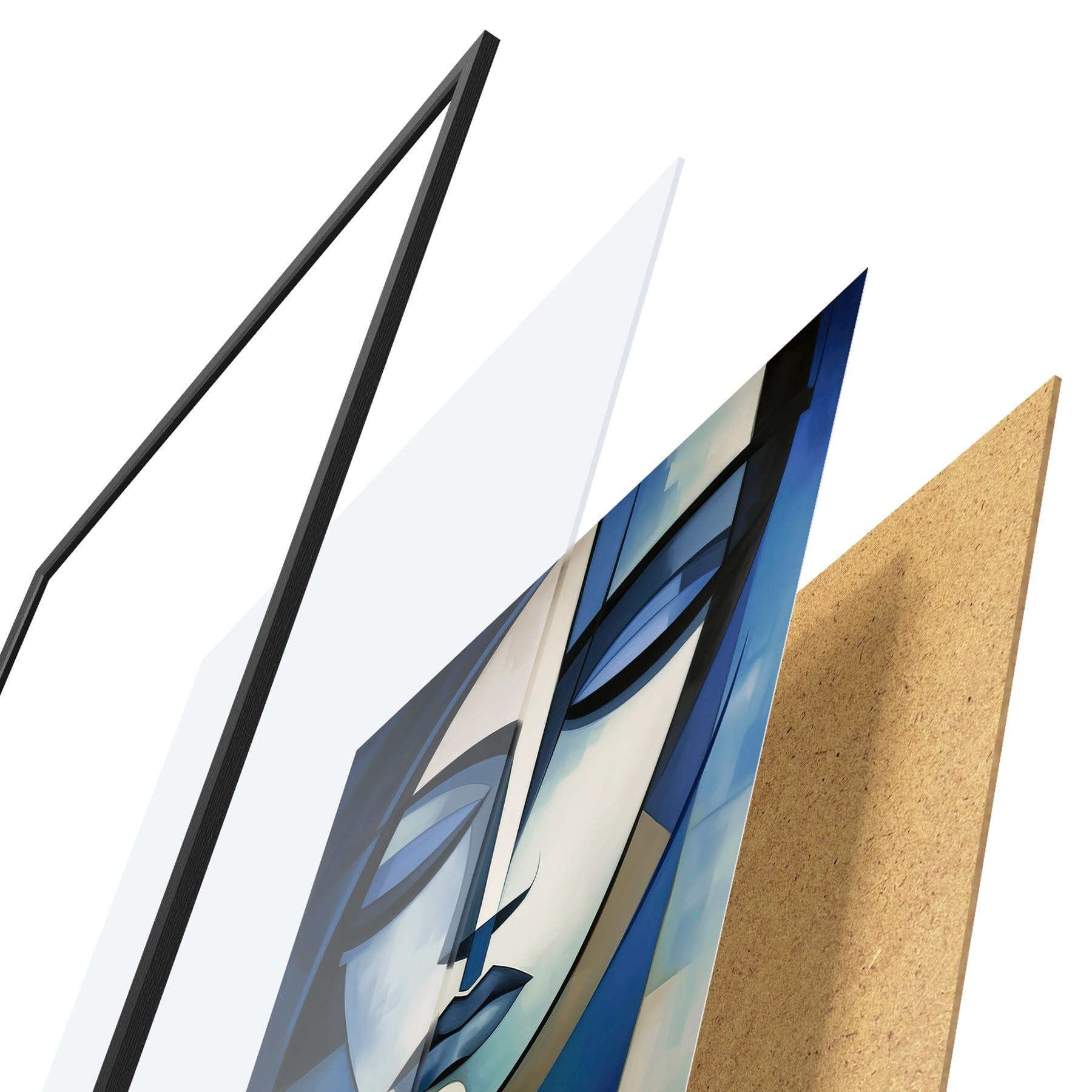 Das Poster besteht aus einem Rahmen, Plexiglas, einem gedruckten Bild und einer Rückwand aus Spanplatten. Dank der Halterungen auf der Rückseite kann das Poster sofort an die Wand gehängt werden.