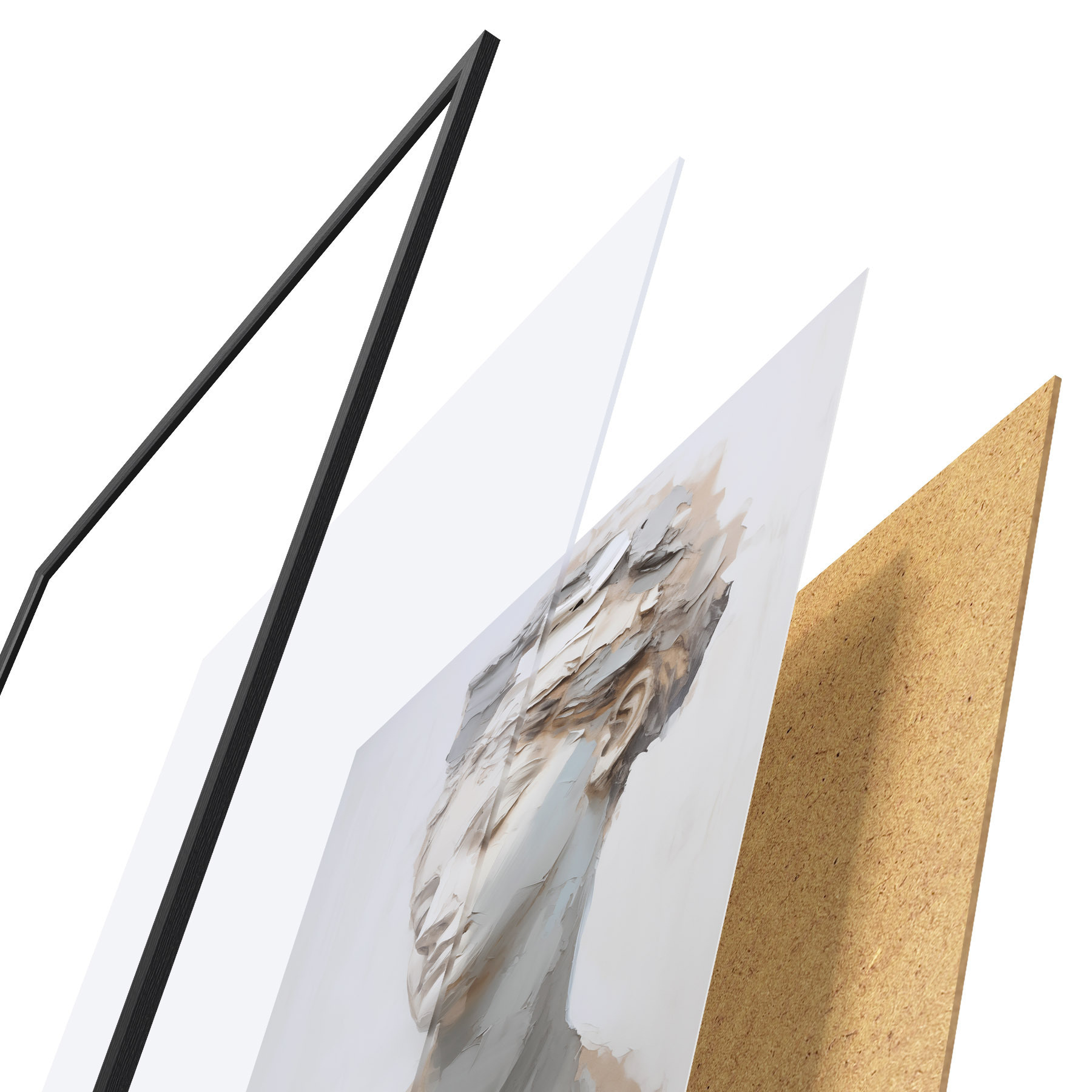 Das Poster besteht aus einem Rahmen, Plexiglas, einem gedruckten Bild und einer Rückwand aus Spanplatten. Dank der Halterungen auf der Rückseite kann das Poster sofort an die Wand gehängt werden.