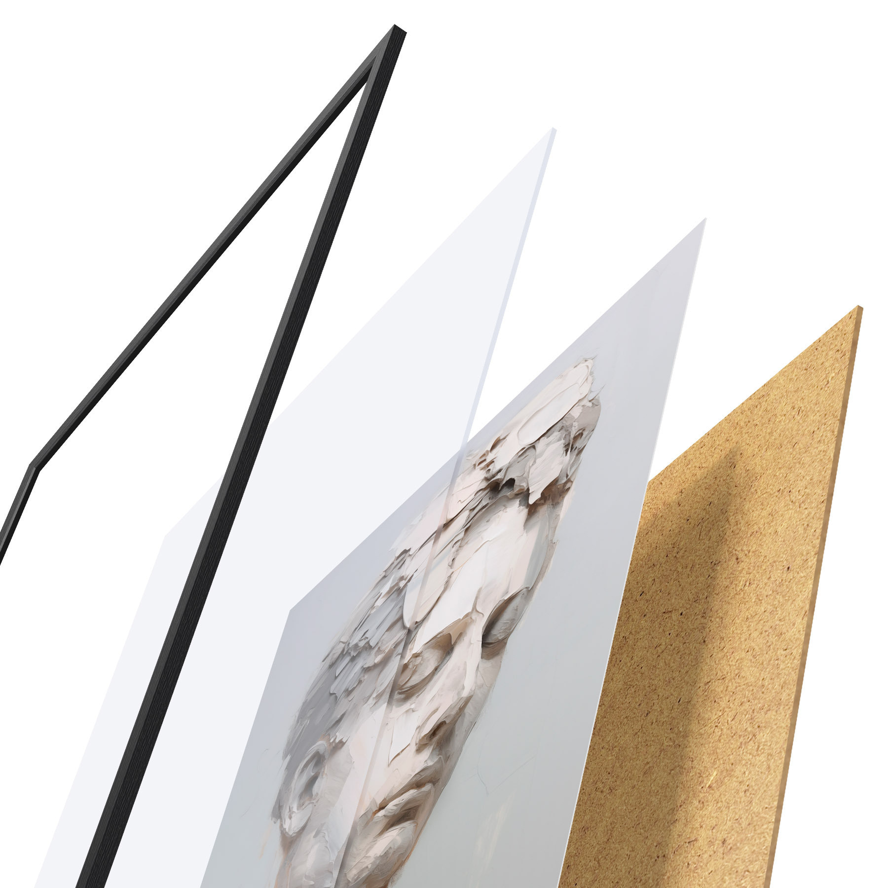 Das Poster besteht aus einem Rahmen, Plexiglas, einem gedruckten Bild und einer Rückwand aus Spanplatten. Dank der Halterungen auf der Rückseite kann das Poster sofort an die Wand gehängt werden.
