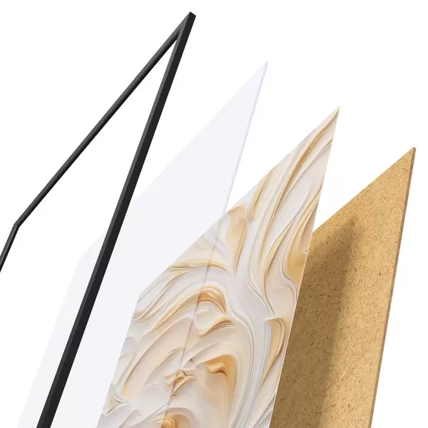 Das Poster besteht aus einem Rahmen, Plexiglas, einem gedruckten Bild und einer Rückwand aus Spanplatten. Dank der Halterungen auf der Rückseite kann das Poster sofort an die Wand gehängt werden.