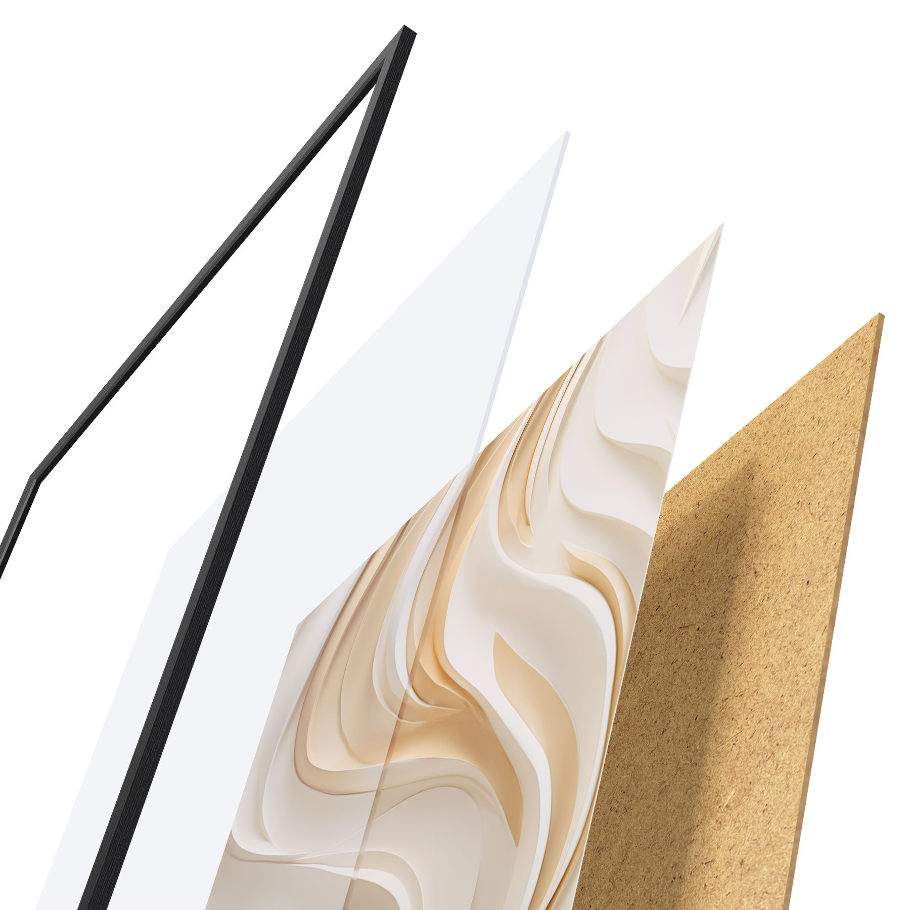 Das Poster besteht aus einem Rahmen, Plexiglas, einem gedruckten Bild und einer Rückwand aus Spanplatten. Dank der Halterungen auf der Rückseite kann das Poster sofort an die Wand gehängt werden.