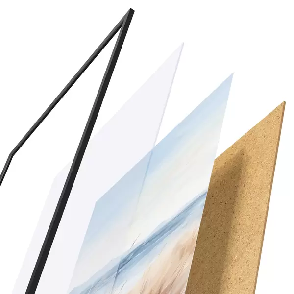 Das Poster besteht aus einem Rahmen, Plexiglas, einem gedruckten Bild und einer Rückwand aus Spanplatten. Dank der Halterungen auf der Rückseite kann das Poster sofort an die Wand gehängt werden.