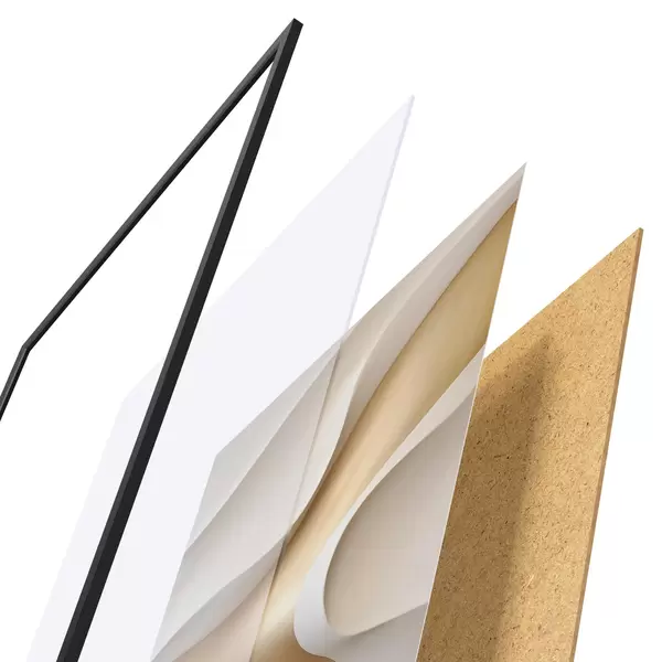 Das Poster besteht aus einem Rahmen, Plexiglas, einem gedruckten Bild und einer Rückwand aus Spanplatten. Dank der Halterungen auf der Rückseite kann das Poster sofort an die Wand gehängt werden.