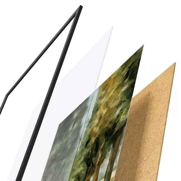 Das Poster besteht aus einem Rahmen, Plexiglas, einem gedruckten Bild und einer Rückwand aus Spanplatten. Dank der Halterungen auf der Rückseite kann das Poster sofort an die Wand gehängt werden.