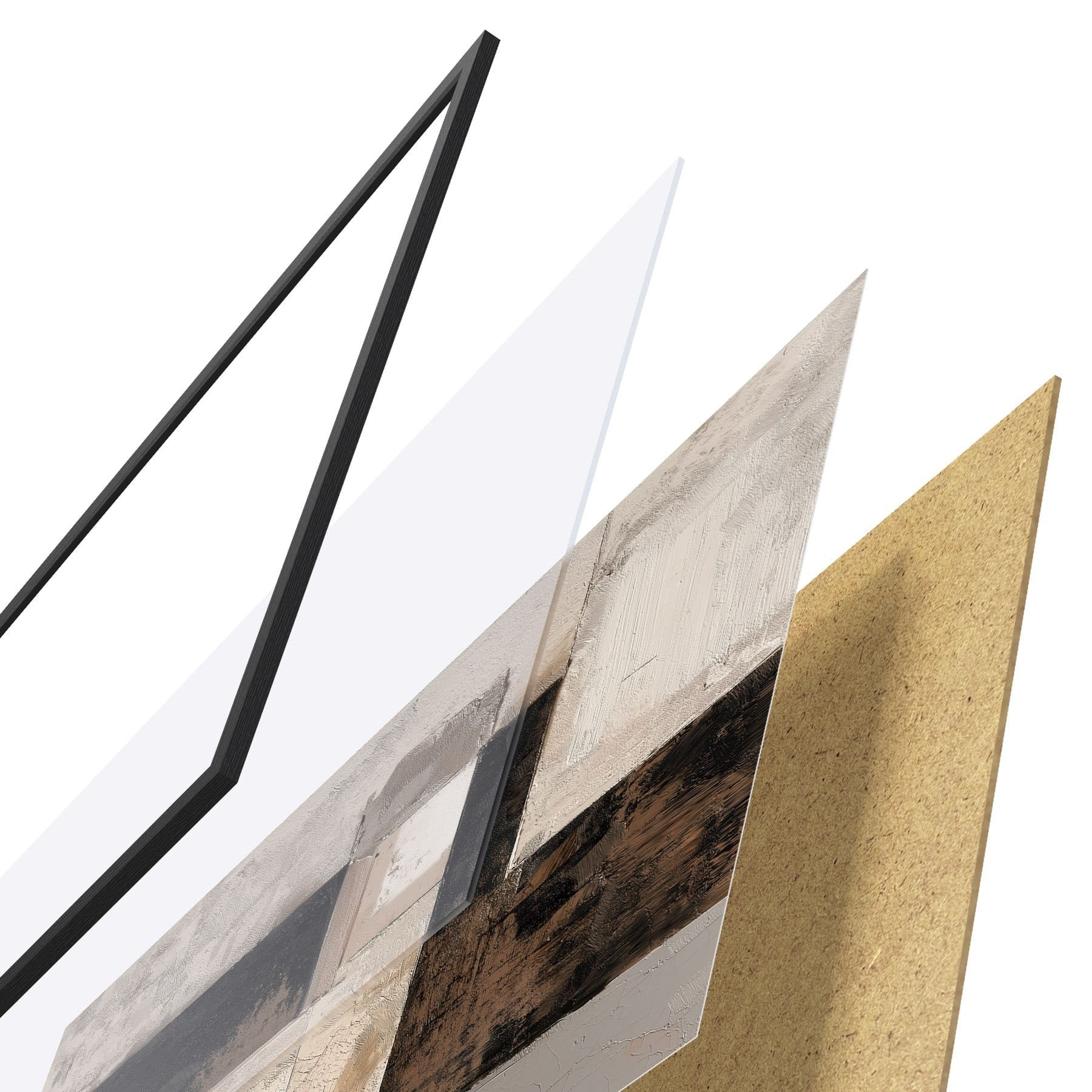 Das Poster besteht aus einem Rahmen, Plexiglas, einem gedruckten Bild und einer Rückwand aus Spanplatten. Dank der Halterungen auf der Rückseite kann das Poster sofort an die Wand gehängt werden.