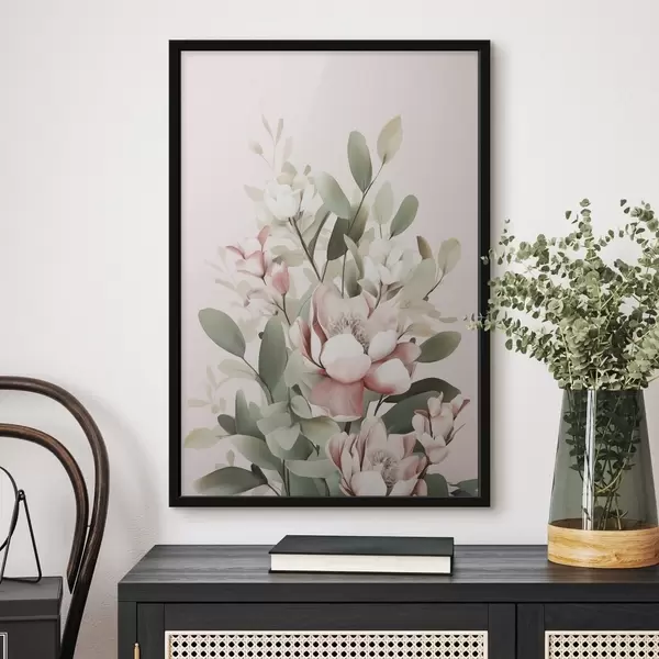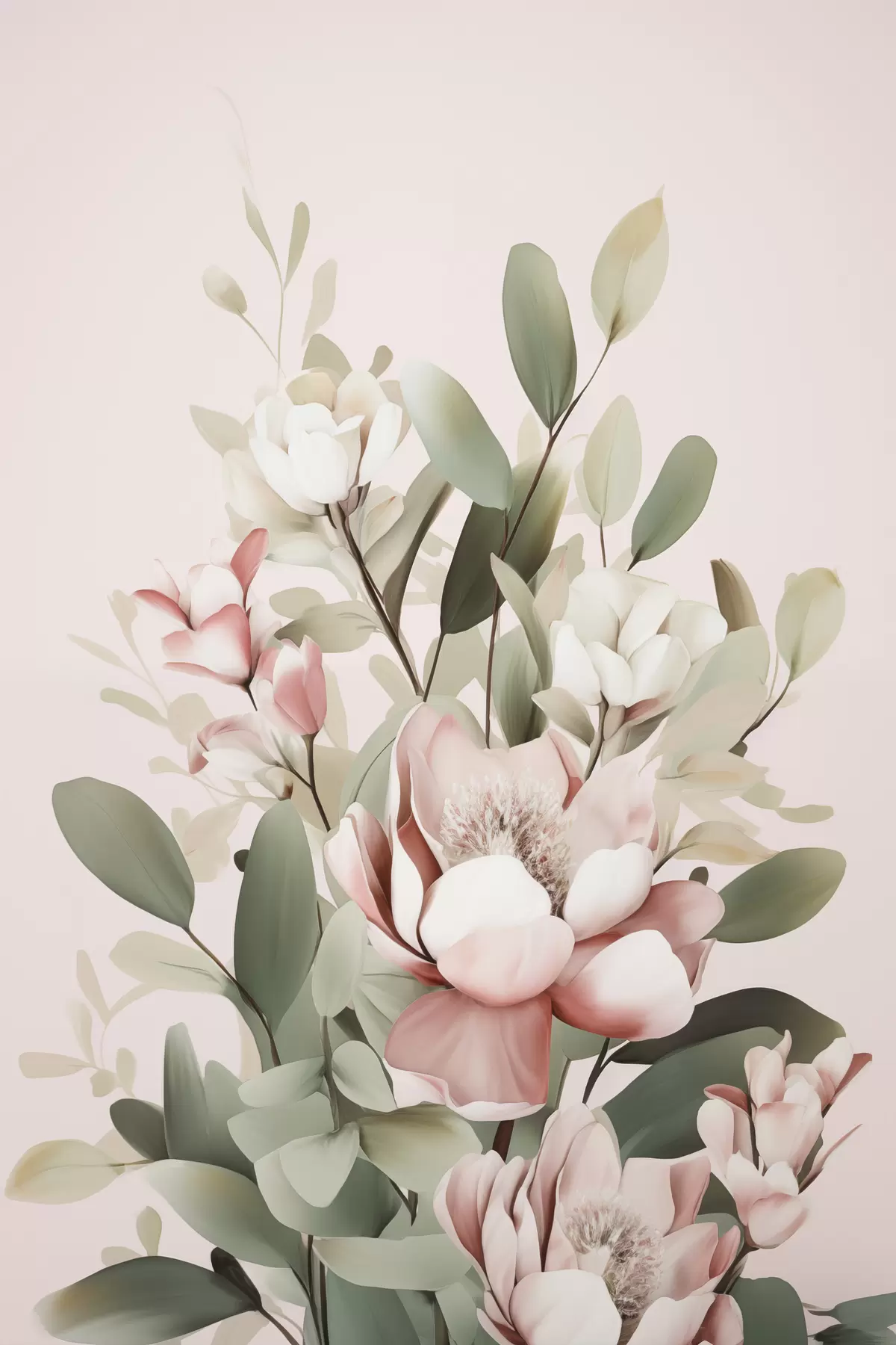 Poster Ein Strauß pastellfarbener Blumen mit Eukalyptusblättern vor hellrosa Hintergrund Nr f48727