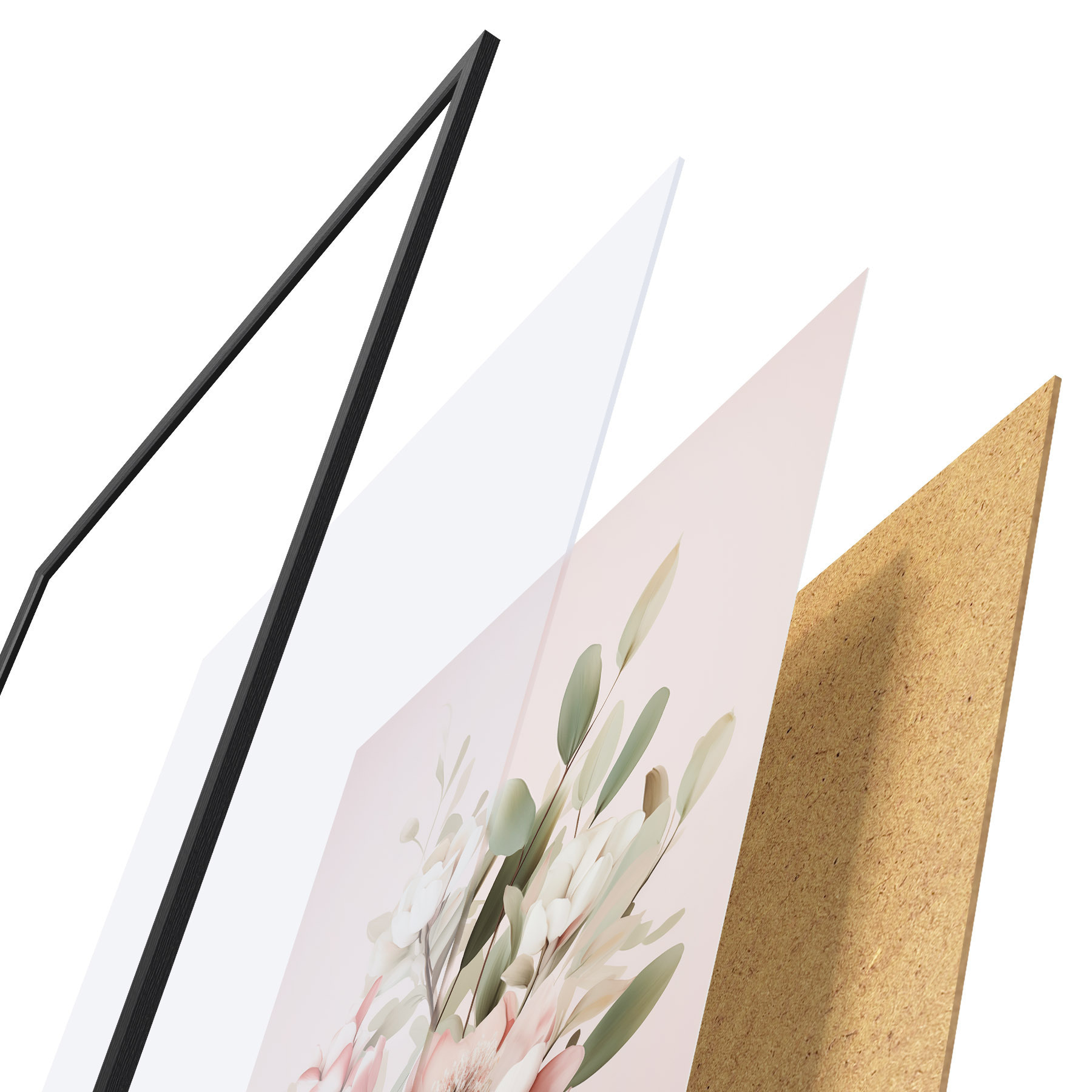 Das Poster besteht aus einem Rahmen, Plexiglas, einem gedruckten Bild und einer Rückwand aus Spanplatten. Dank der Halterungen auf der Rückseite kann das Poster sofort an die Wand gehängt werden.
